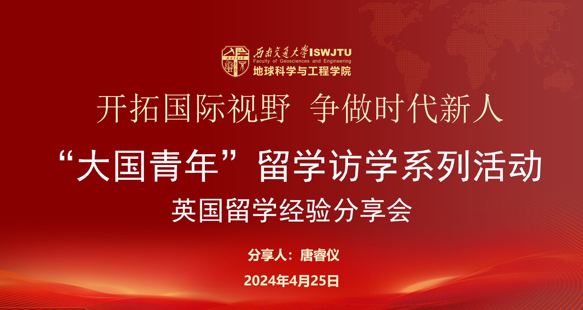 2025 年4月25日晚,“大国青年”留学系列——英国访学与留学经验分享会在X4155教室举行。安全工程(中外)专业2019 级学生唐睿仪受邀为大家分享自己在英国进行访学留学的经历。