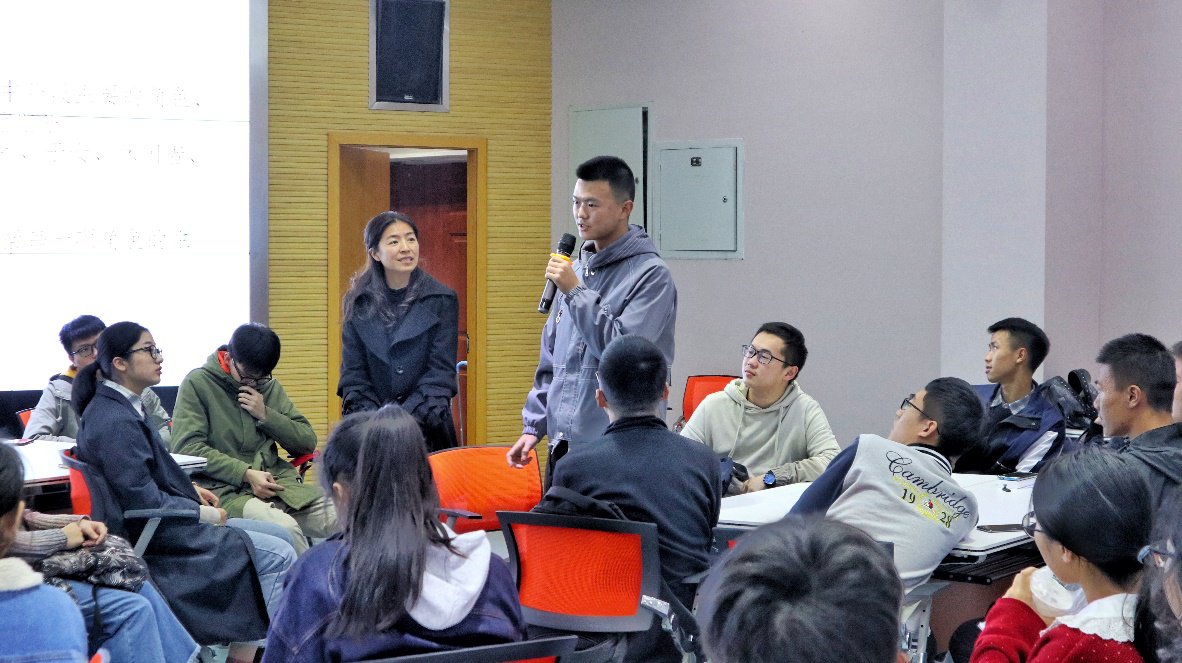 之后,彭老师为大家提供了几份优秀学长学姐的简历模板,大家思考并讨论简历中学长学姐的经历。对于就业,我们已经做好了哪些准备;对于未来,我们又有着怎样的打算。讨论完成之后,彭老师邀请了几组同学上台分享,某位班委讲到:我要从大一开始规划自己的简历,逐步充实自己,多考证,多比赛,把精力放到证明自己的专业知识上。还有班委讲到:社团和学校组织工作可以锻炼自己的领导能力,我希望自己毕业时的简历能表现出我的综合能力,不止关注各种各样的比赛,还能体现出自己的组织能力。任老师肯定了大家的想法并一一提出了自己的建议。大学生的专业能力和综合能力都是充实一份好的简历,也就是充实自己大学四年生活的标杆,在能平衡各种各样角色的前提下,我们不仅要在学习专业知识时尽最大努力,也要注重综合能力(领导能力、组织能力等)的培养提升。同学们受益匪浅。