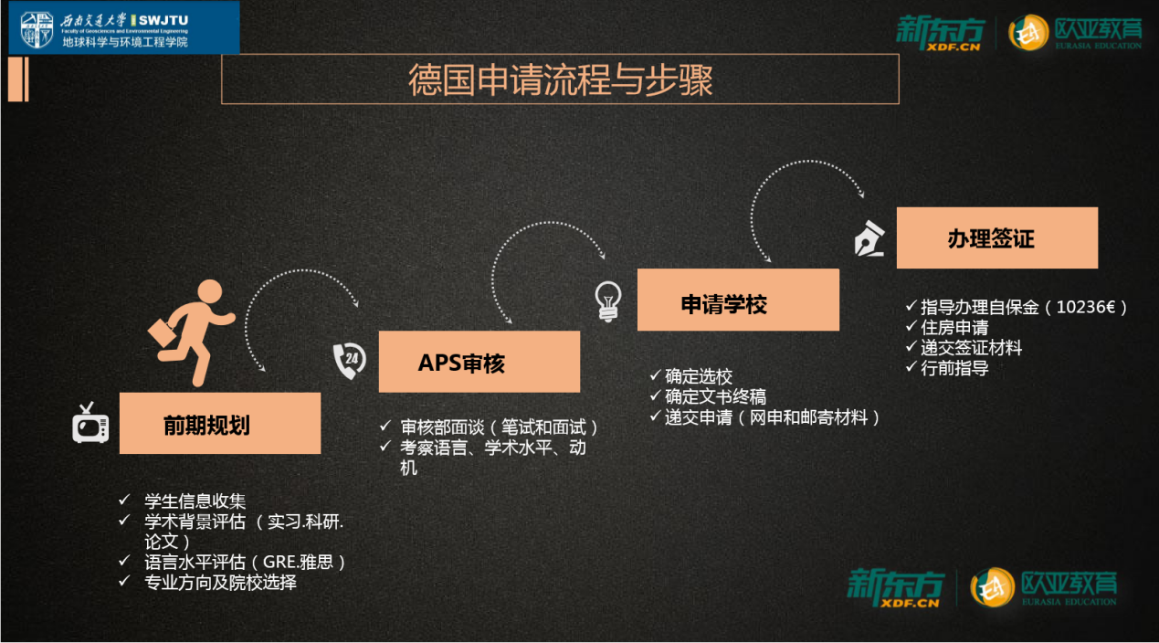 讲座第二阶段,张老师为同学们介绍了欧洲对口院校与专业,并且为大家介绍了欧洲一些比较出名的一些大学的基本情况。随后,张老师说明了准备去欧洲留学需要做的一系列准备,以及时间规划,希望有需要的同学可以有所收获。并且以德国申请流程与步骤为例,给大家介绍了去欧洲留学的基本步骤。