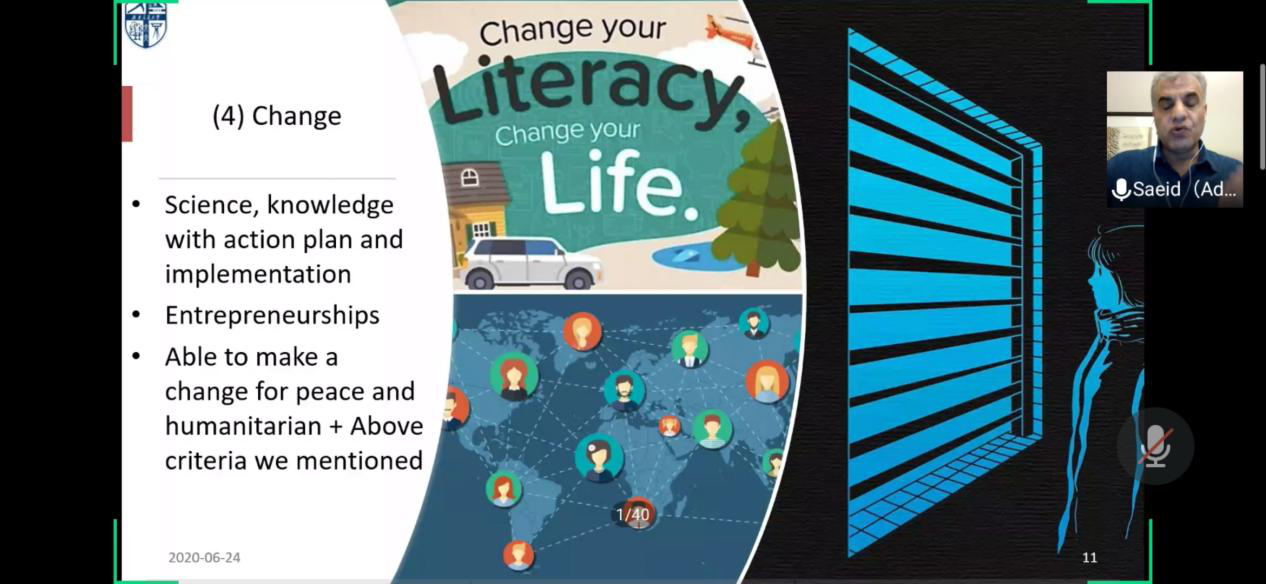 教授提出了“Change your Literacy, Change your Life”的观点,并给出了三点改变的建议和收益:1.Science, knowledge with action plan and implementation(科学,知识,行动计划和执行)2.Entrepreneurships(创业)3.Able to make a change for peace and humanitarian+Above criteria we mentioned(能够改变和平和人道主义+上述我们提到的)