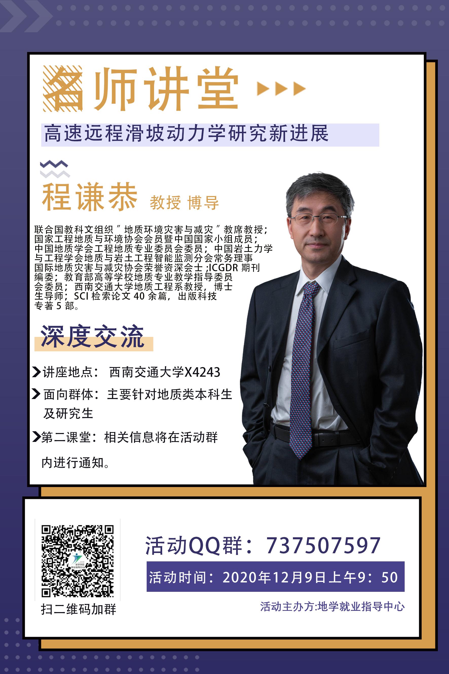 主讲人简介:水文地质工程地质理学博士。现任西南交通大学地球科学与环境工程学院地质工程系教授,博士生导师。任联合国教科文组织(UNESCO)“地质环境灾害与减灾”教席教授;国际工程地质与环境协会(IAEG)会员暨中国国家小组成员;中国地质学会工程地质专业委员会委员;中国岩石力学与工程学会地质与岩土工程智能监测分会常务理事;国际地质灾害与减灾协会荣誉资深会士(ICGdR Honorary Fellow)、助理主席;国际大滑坡协会(iRALL)会员;ICGdR期刊 《Geoenvironmental Disasters》编委;《工程地质学报》编委;教育部高等学校地质学类专业教学指导委员会委员。教育部全国学位与研究生教育评估专家等;主持与主研国家自然科学基金重大专项、重点项目、国际(地区)合作与交流项目、面上项目,国家第二次青藏高原科考项目、国家重点研发计划项目、973计划项目,教育部科学技术研究重点项目,铁道部科技研究开发计划项目,交通部西部交通建设科技项目等近80项科研工作。在国内外学术期刊和学术会议发表论文150余篇,SCI检索论文40余篇,出版科技专著(含合著)5部(第一作者2部);获省部级二、三等科技进步奖10项。已培养博士生19名,硕士生92名;正在培养博士生5名、工学硕士生18名、工程硕士生10名。