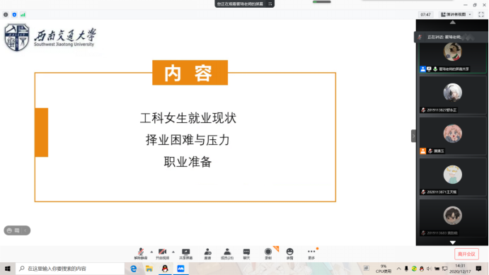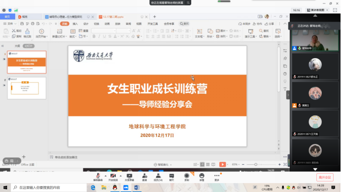就业指导中心“女生职业成长训练营”系列活动第二期——导师经验分享会在腾讯会议顺利举行。为积极响应学校防疫政策与要求,本次活动以线上会议的形式开展。活动由就业指导中心郑文娇老师主持,邀请到本17级毕业生辅导员翟琦老师做分享。