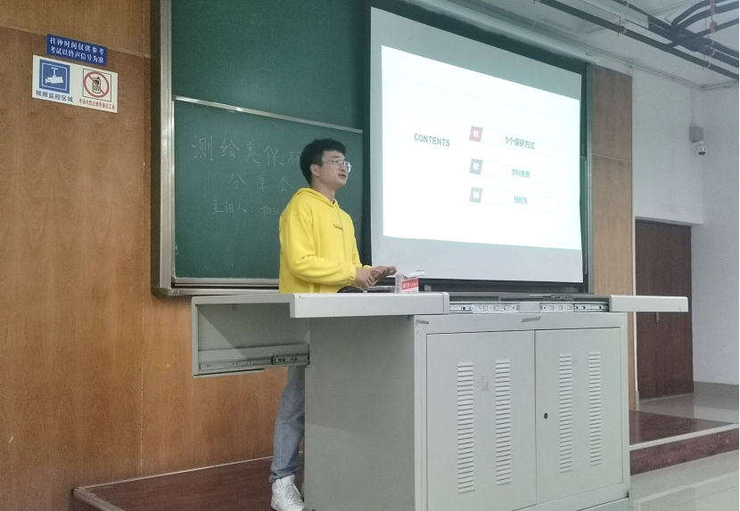 测绘类专业的保研情况,以及成绩排名,支教保研,免研辅导员等保研途径与相应的条件要求。接着,他为同学们讲解了一些加分的竞赛的类别,竞赛的加分政策,竞赛中可能遇到的问题等事项,其中着重介绍了“创新创业创青春”挑战杯竞赛。