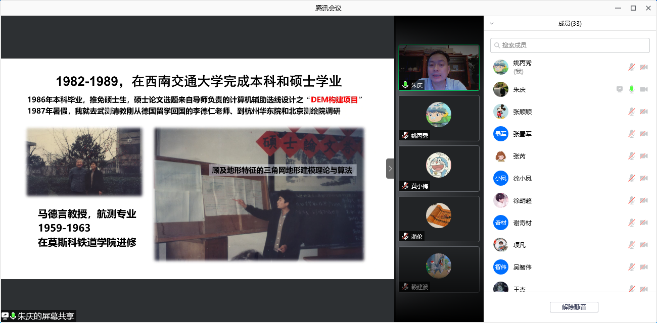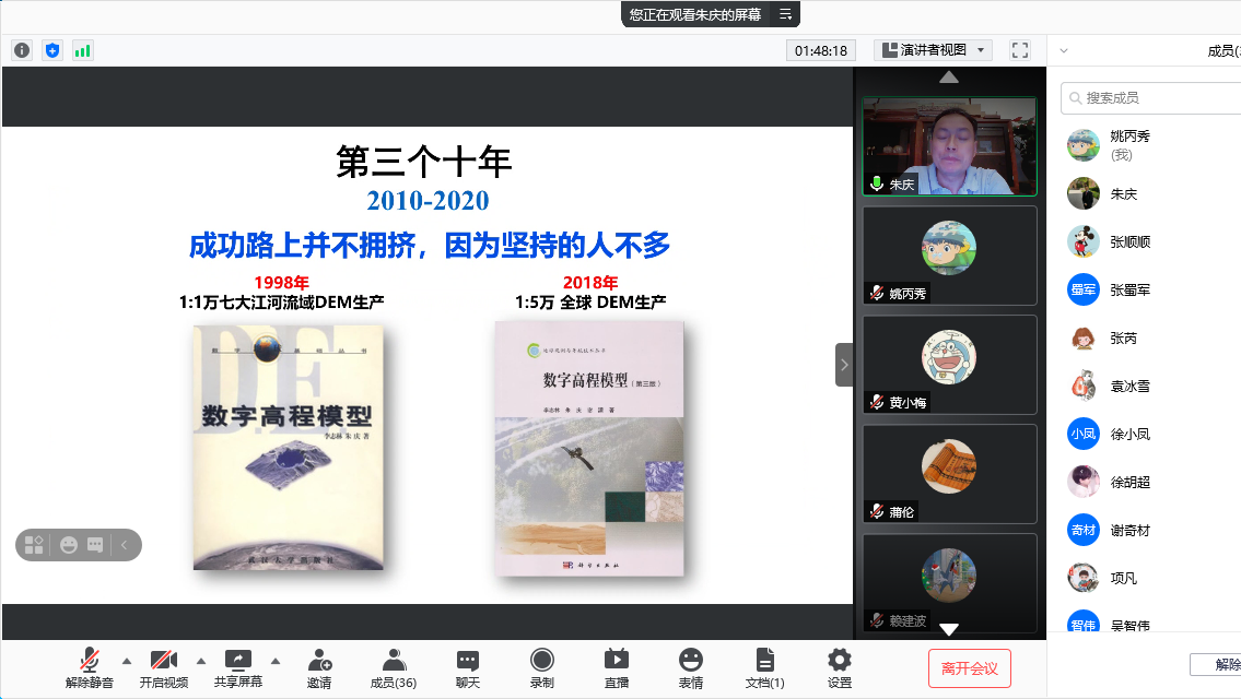 之后朱庆同志分享了自己科研的第三个十年成就。从2018年开始参与川藏铁路的规划建设,他深切感受到测绘地理信息在川藏铁路建设中发挥着关键支撑和引擎作用。数字孪生是川藏铁路信息化的重要标志,也是建设智能川藏铁路的新途径,支撑着物理空间和信息空间中孪生铁路全生命周期的精准映射与融合协同。朱庆老师参与了川藏铁路重大灾害风险识别与预测的专项课题,发表了数篇有关数字孪生川藏铁路的学术论文,获得了国家自然科学二等奖和国家科技进步二等奖,积极发挥了测绘人在川藏铁路建设中起到的重要作用。朱老师还参与编著了1998年和2018年版《数字高程模型》教材的部分内容。