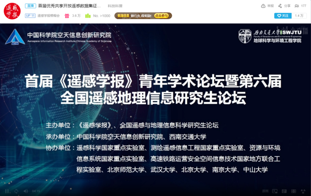 2021年9月25-26日,首届《遥感学报》青年学术论坛暨第六届全国遥感地理信息研究生论坛在知网、B站及科创中国线上平台举行。本次论坛由遥感学报、全国遥感与地理信息科学研究生论坛主办,西南交通大学、中国科学院空天信息创新研究院承办。