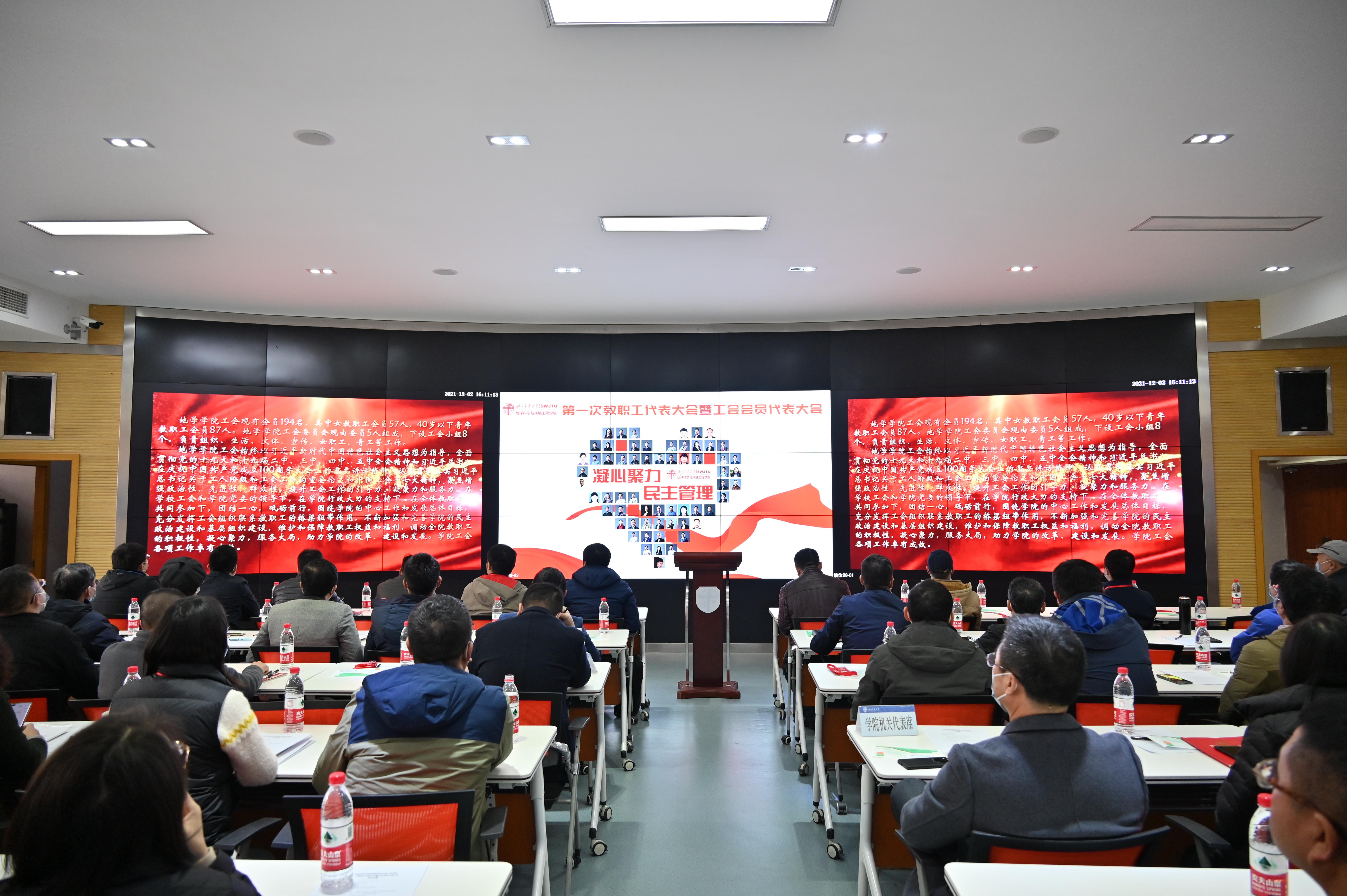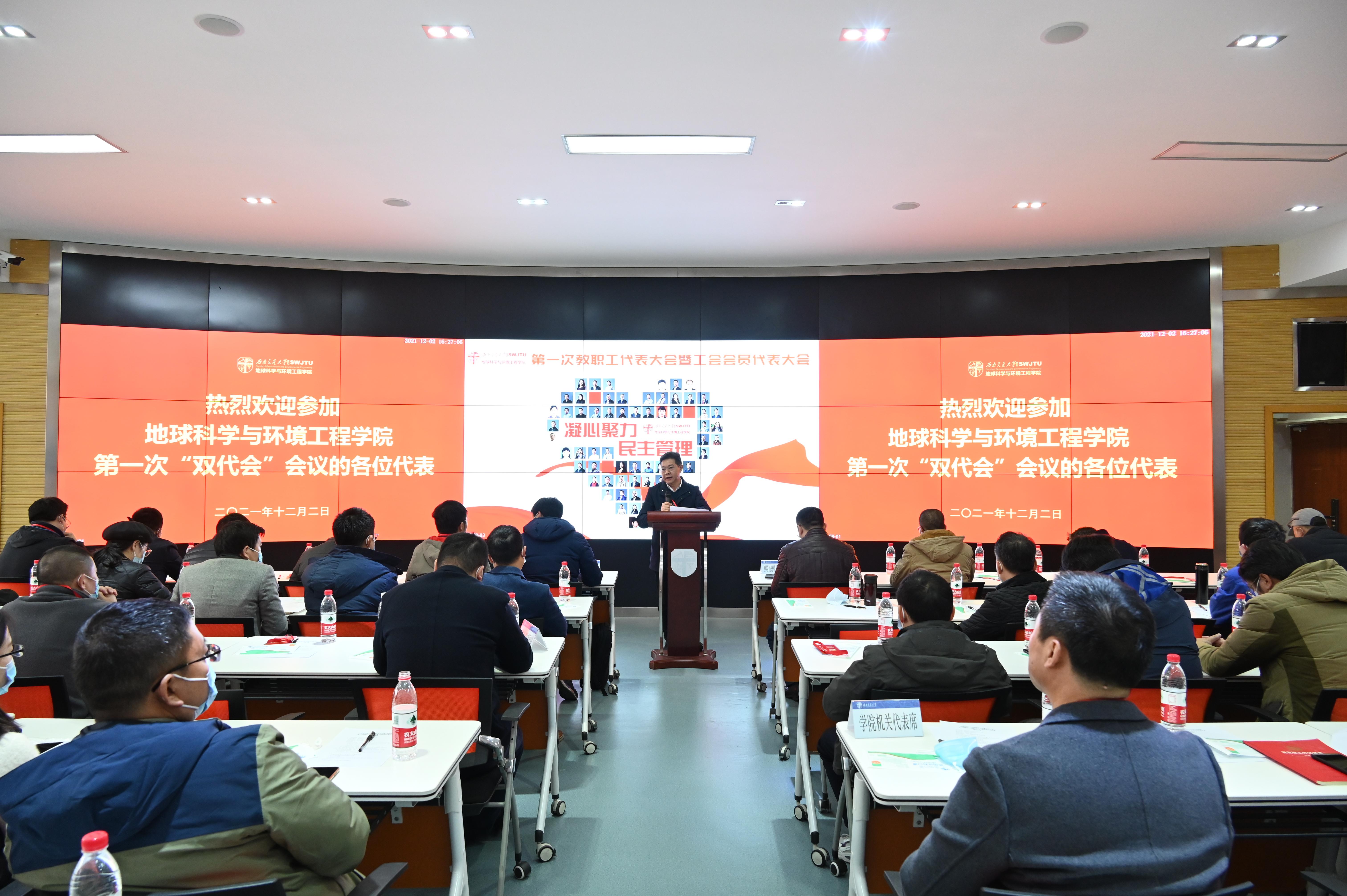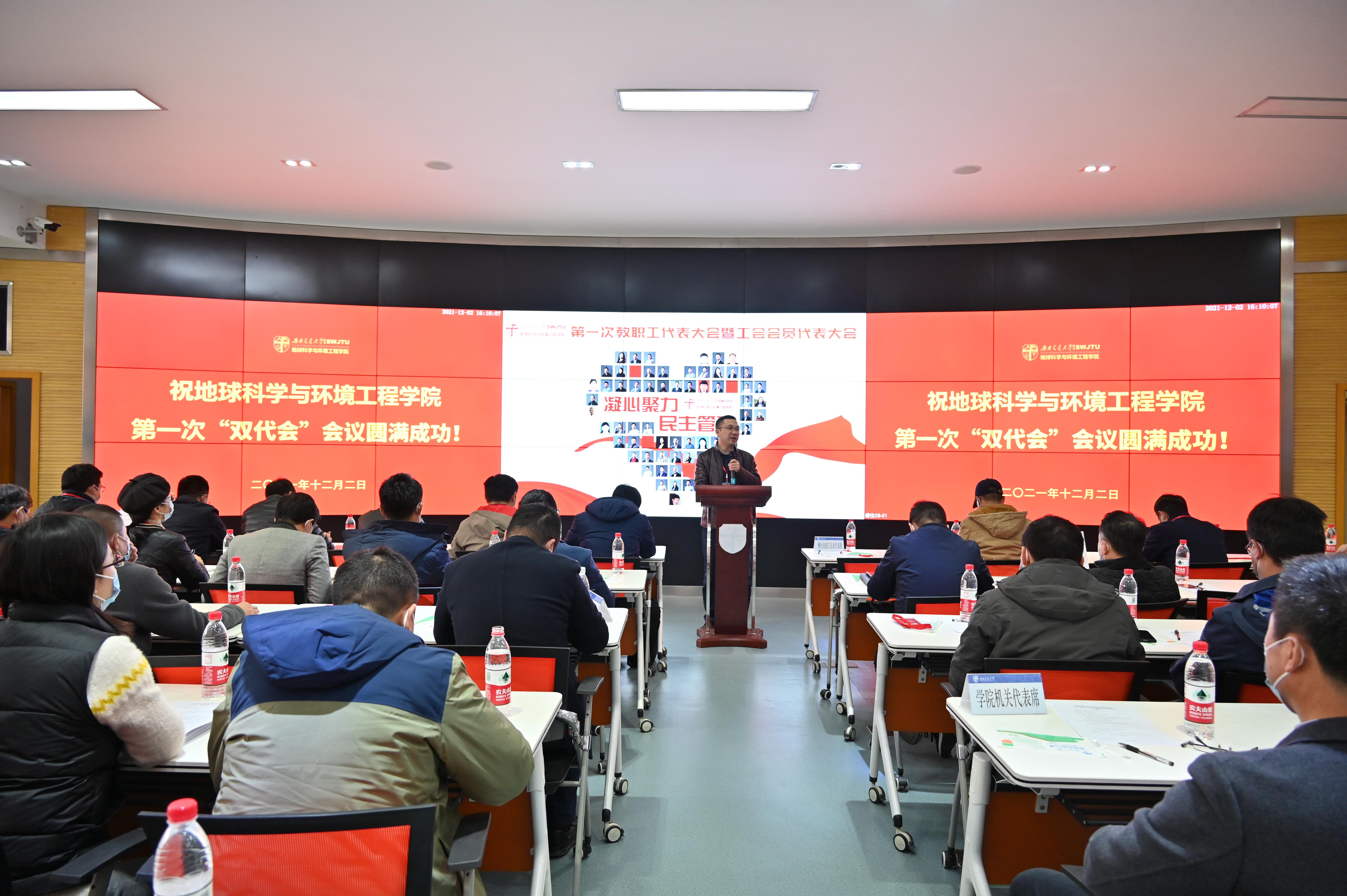 在全院上下开展党史学习教育掀起高潮,深入学习贯彻十九届六中全会精神之际,西南交通大学地球科学与环境工程学院第一次教职工代表大会暨工会会员代表大会于2021年12月2日下午4:00在犀浦校区4243召开。此次大会采取线下方式举行,应到代表61人,实到代表55人,本次大会的工作任务是审议学院上一届工会委员会工作报告和工会会费收缴及经费使用情况的报告、选举产生学院新一届工会委员会委员、选举产生学校“双代会”代表。学院党委副书记、纪委书记傅尤刚同志主持本次大会,学院党委书记关秦川同志致辞,学院执行院长刘国祥同志讲话。