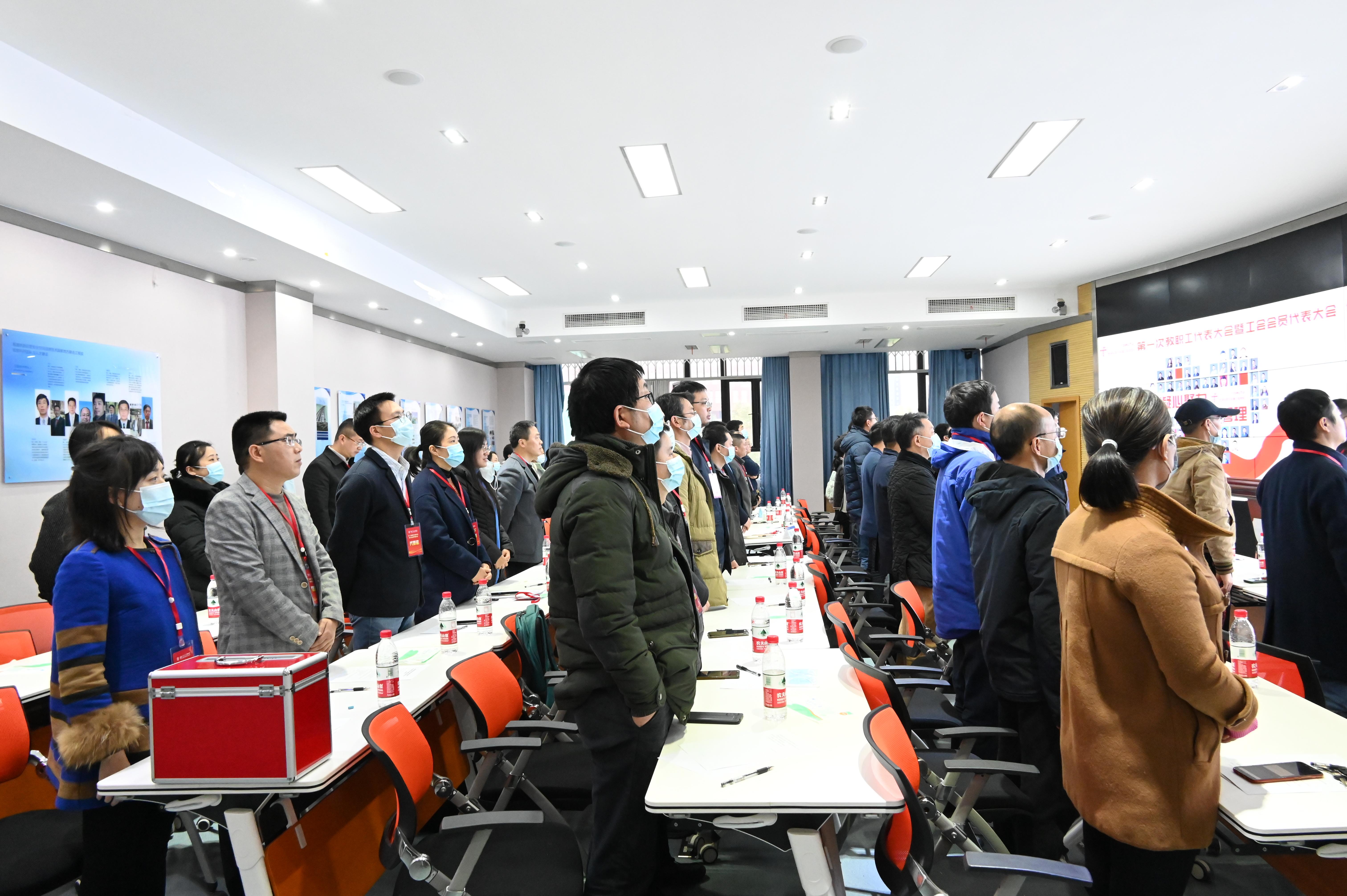 2021年12月2日下午4:00,学院党委副书记、纪委书记傅尤刚同志宣布地球科学与环境工程学院第一次教职工代表大会暨工会会员代表大会开幕,全体起立奏唱国歌。