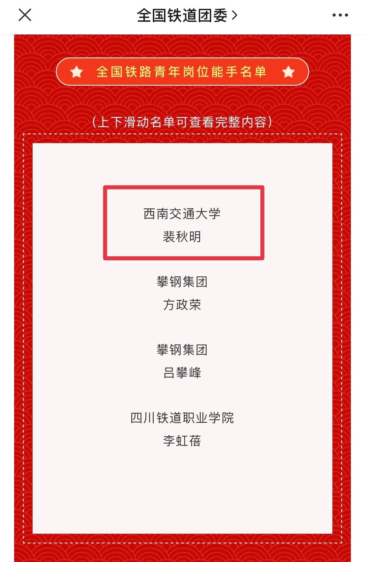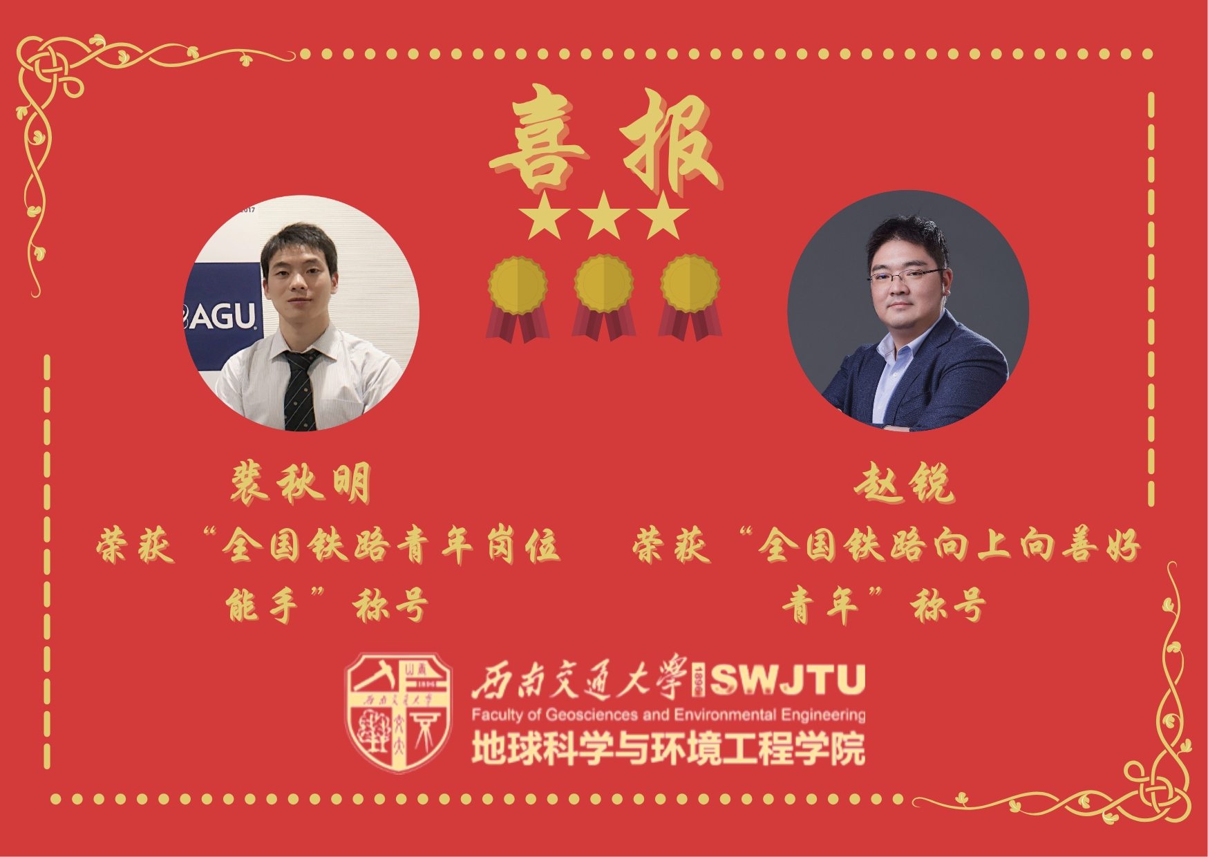 教师裴秋明荣获“全国铁路青年岗位能手”称号,赵锐教授荣获“全国铁路向上向善好青年”称号。