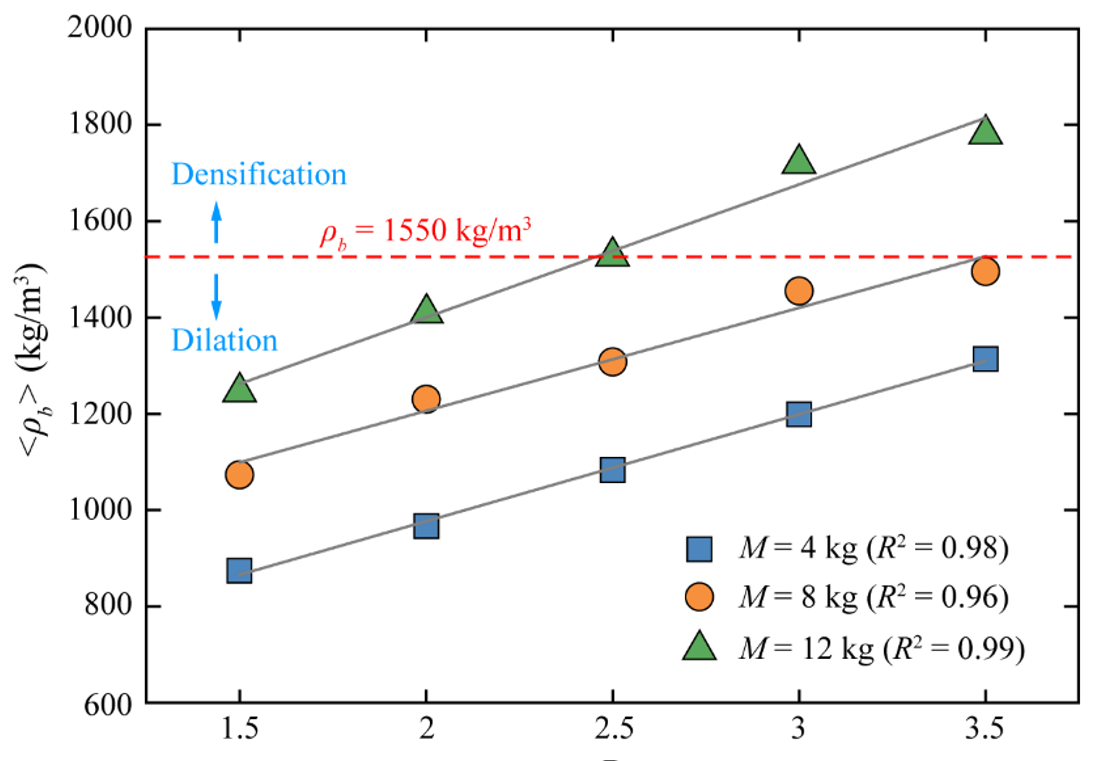 (2)实测颗粒流平均正应力与颗粒流厚度密切相关,主要反映了颗粒流作用于基底的静荷载,应力向基底的传递主要通过持续接触的颗粒完成。平均正应力随粒径和体积的变化反映了颗粒流动态堆积密度的变化,随着分形维数D和体积的减小,动态堆积密度呈现降低的趋势(图1),反映了颗粒流中颗粒的弥散现象。