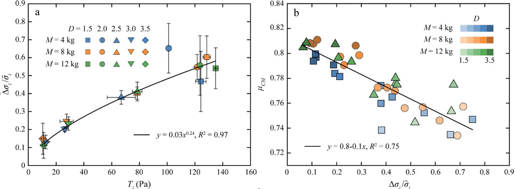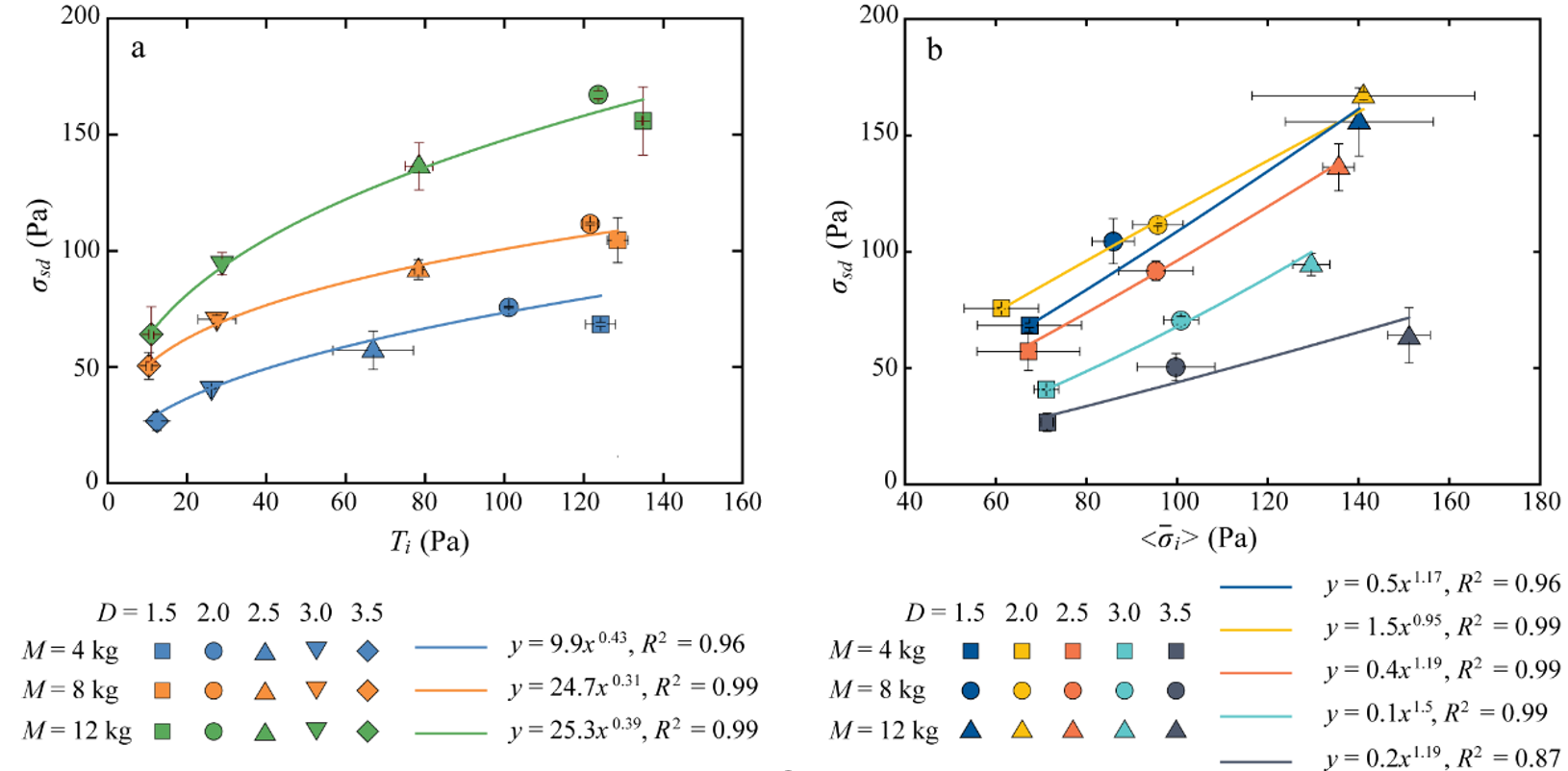 (a. 颗粒流波动应力标准差与颗粒惯性力的关系;b. 颗粒流波动应力标准差与时间平均正应力关系)