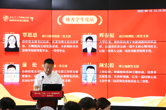 随后,学院党委副书记、副院长许军华宣读了《中共西南交通大学地球科学与环境工程学院委员会关于2021-2022年“两优一先”表彰的决定》。许军华号召全院党员要以受表彰的先进典型为榜样,胸怀“两个大局”,当好时代答卷人,为把学院建设成为国内一流、具有国际影响力、地学特色鲜明的国际化示范学院作出新的更大贡献,以优异成绩迎接学校第十五次党代会胜利召开。宣读完毕,学院党委关秦川书记、许军华副书记依次为获得“先进党支部”、“优秀党务工作者”、“优秀党员”的同志颁发荣誉证书,并进行合影留念。