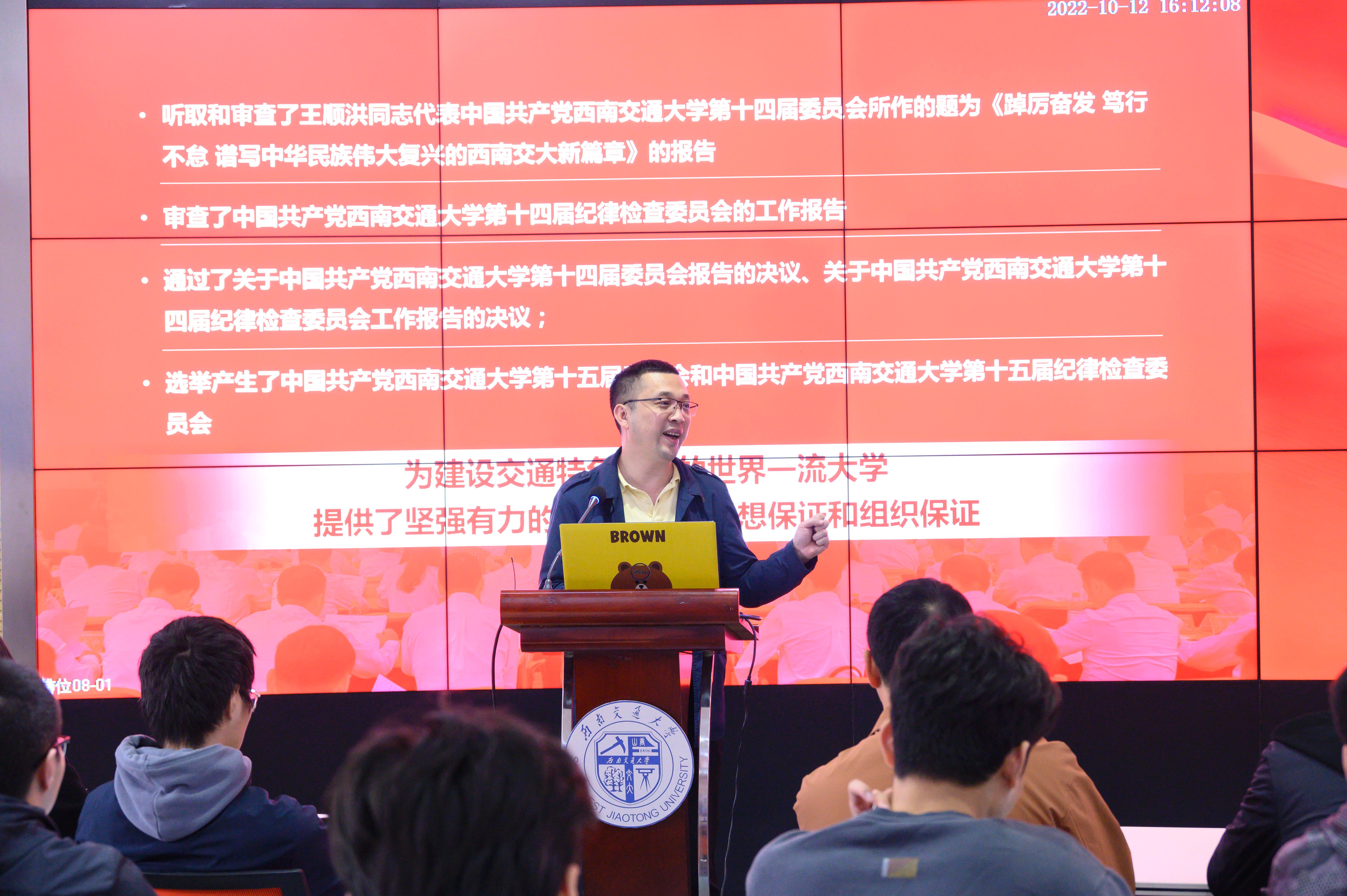 首先,傅尤刚书记向在座党员介绍西南交通大学第十五次党代会基本情况及其重要意义。大会上,西南交通大学党委书记王顺洪同志代表中共西南交通大学第十四届委员会,向大会作题为《踔厉奋发 笃行不怠 谱写中华民族伟大复兴的西南交大新篇章》的工作报告,回顾总结了第十四次党代会以来学校建设所取得的成就,客观分析了学校发展过程中存在的不足,明确提出了未来五年学校高质量发展的实现途径。