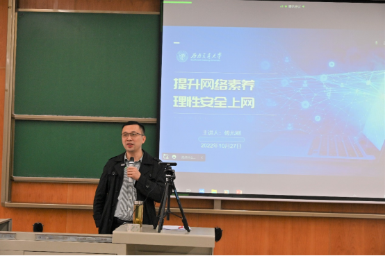 傅尤刚讲到,大数据时代的到来,网络已经成为所有人学习、生活的一部分注重网络素养的培养和提升显得尤为重要,实现文明、安全上网是对所有同学的要求。他首先对于我国网络的普及度进行了说明,指出青少年上网变化趋势,阐述风险隐患,强调网络素养教育的必要性。随后,他从网络素养及其特征、大学生网络失范行为与案例分析、大学生如何提升网络素养三个方面,向同学们介绍了网络安全的基本常识,提醒同学们要保持头脑清醒,禁住诱惑,进而提升自我保护意识。傅尤刚强调,同学们要注重培养网络信息甄别能力、借助网络学习的能力,促就文明上网的自觉性,严守法律法规,做到文明上网。