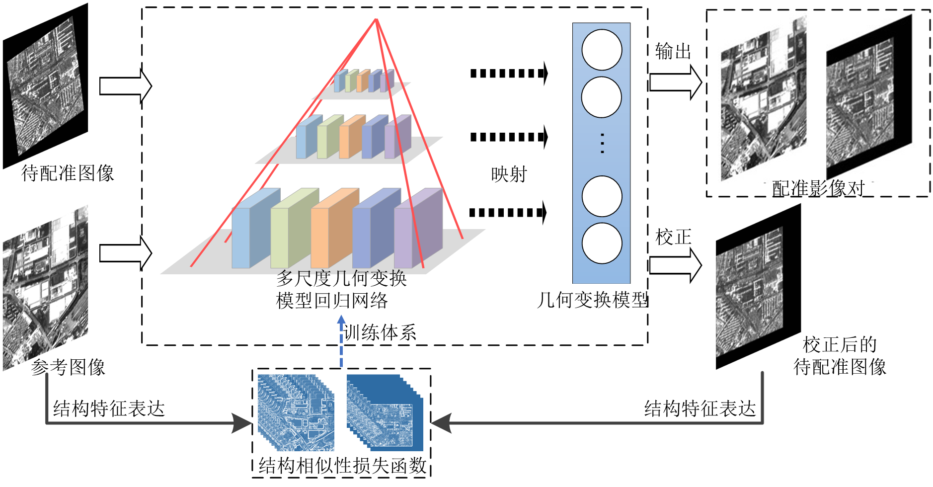 叶沅鑫老师及其研究生合作的论文“叶沅鑫,唐腾峰,朱柏,杨超. 一种无监督学习的多尺度遥感影像配准网络”荣获大会优秀论文奖。论文提出一种无监督学习的多尺度配准网络,在不需要真值标签的条件下,串联多尺度网络以构成“由粗至精”的配准流程,并设计基于结构相似性的网络损失函数,从待配准影像中映射出转换参数,有效克服了多模态遥感影像间的几何畸变和辐射差异,克服主流深度学习配准方法依赖于大量的标签样本的局限性,实现遥感影像的精确配准。