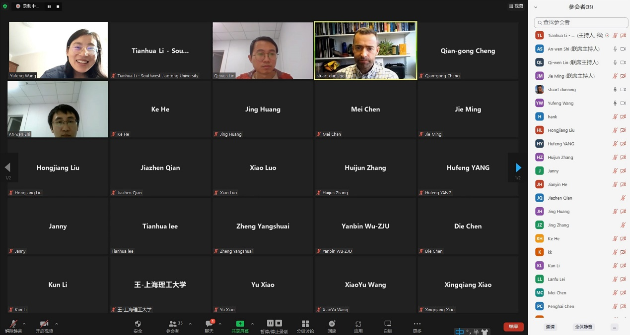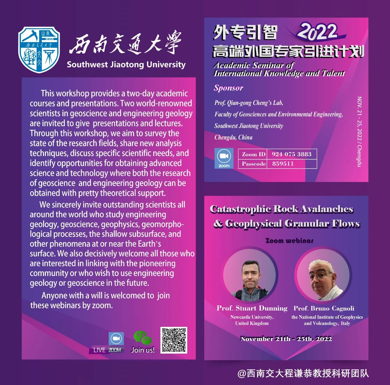 2022年11月21日至25日,由西南交通大学地球科学与环境工程学院程谦恭教授主持的2022年度“外专引智-高端外国专家引进计划”学术活动顺利举办。来自国际知名高校及科研机构的杰出科学家Stuart Dunning和Bruno Cagnoli分别围绕高速远程滑坡沉积学特征与颗粒流动力学特性研究,呈现了精彩的学术报告。本次活动以网络视频会议方式开展。参会人员认真听取学习了2位专家的学术报告,并在会后积极与专家交流,受益匪浅。