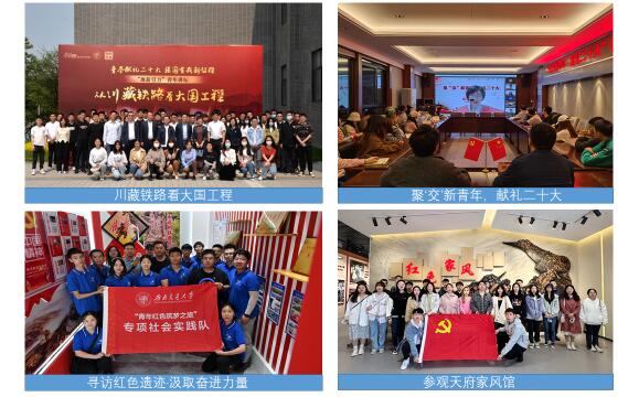 坚定理想信念,把稳实践育人方向。通过“学习二十大精神,争做新时代先锋”主题活动深入学习宣传贯彻党的二十大精神;通过“寻访红色遗迹·汲取奋进力量”——川藏铁路沿线党史研学实践活动,在红色遗迹中汲取奋进力量。通过“聚‘交’新青年,献礼二十大”与上海交通大学、漫蛙漫画