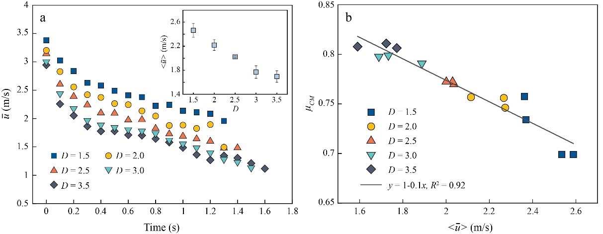 针对Cagnoli教授的评论,程谦恭教授团队王玉峰等对上述实验研究成果进行了重新审视和进一步的阐述,并针对评论稿中所涉及的关键问题进行了全方位的回复。首先,在回复稿中,对于物理模型实验初始条件的控制以及在实验过程中应对附加现象的处理方法进行了进一步说明;其次,从野外地质证据、实验模型及数值模拟三个方面出发,论述了本实验中选用坡度转折模型的依据,并通过建立颗粒流速度与等效摩擦系数的定量关系,分析了坡度转折对颗粒流流动性的影响效应,结果表明,在抵达坡度转折之前,颗粒流流动性已经表现为随粒径增大而增加的趋势(图1),因此,在本实验中,坡度转折处的颗粒流碰撞并未对实验结果产生影响;第三,通过详细对比本实验与Cagnoli数值模拟结果,得出离散元模型中初始条件、边界条件及颗粒间接触模型的简化是两者之间存在差异的主要原因;最后,进一步阐明了颗粒扰动、基底波动应力和颗粒流流动性之间的关系,强调了颗粒流基底波动应力的减阻效应,即颗粒扰动只是基底波动应力的一种表现形式,而波动应力的产生才是促进颗粒流流动性的内在因素。
