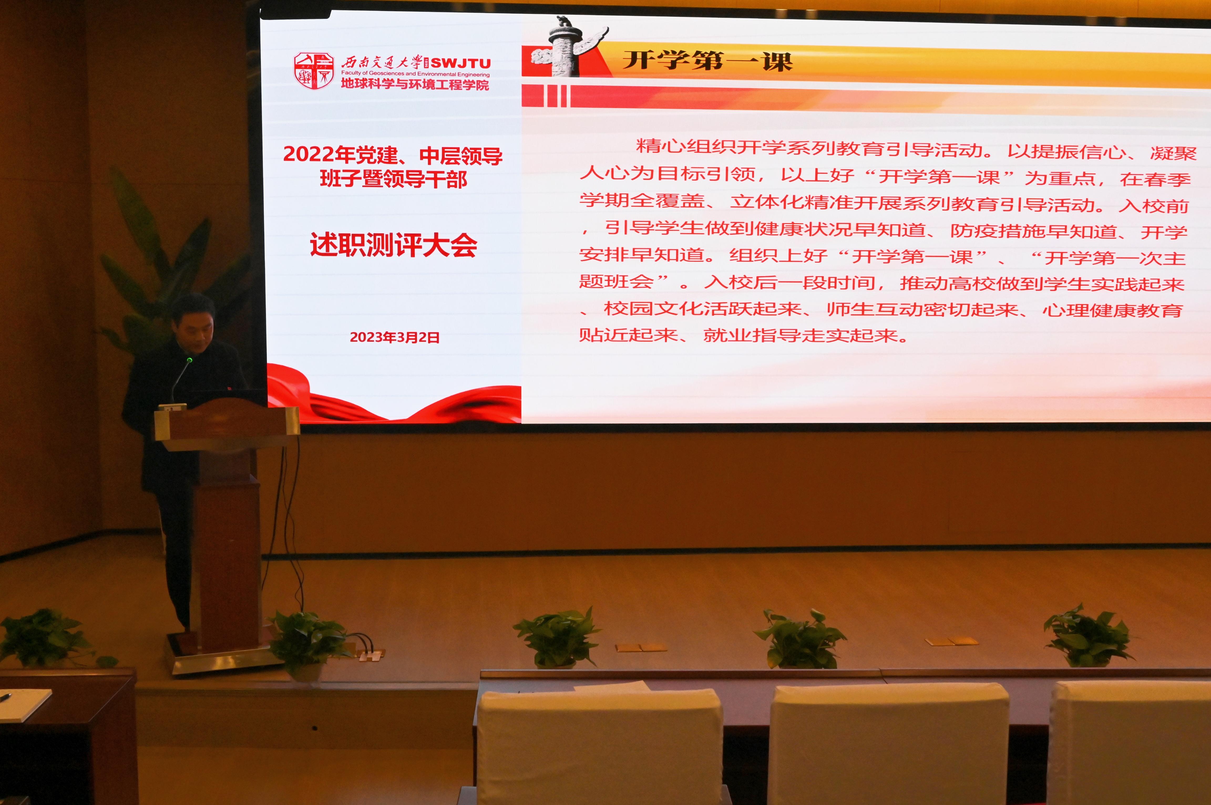 关秦川代表学院党委进行题为“党建引领 蓄势薄发——让党建成为凝聚人心的‘地心引力’”工作述职,围绕政治引领、思政引领、榜样引领、品牌引领、内涵引领,对2022年学院党建工作所释放出的“红色引力”“内生引力”“奋进引力”“幸福引力”“发展引力”进行回顾总结。他强调,2023年是全面贯彻落实党的二十大精神的开局之年,是学校第十五次党代会以质量提升为核心攻坚之年,也是学院新一轮发展开局之年,同时也是实施“十四五”规划承上启下关键之年,人勤春来早,功到竢华实,学习二十大、贯彻党代会、奋进新征程,全体地学人重任在肩,并结合“开学第一课”具体要求,引导全体成员精心谋划,以提振信心、凝聚人心为目标引领,立足知信行统一,全覆盖、立体化开展好系列教育引导活动。最后,他以“地久天长,厚积薄发,果毅力行新时代;学以致用,凝心聚力,忠恕任事新征程”与全体地学人共勉。