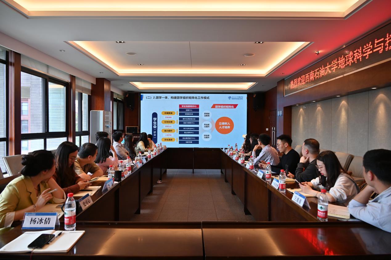 指导工作,座谈交流会在X4520举行,与会人员有:学院党委副书记郑波、团委书记杨都强、团委副书记翟琦、李婧,辅导员孙惠敏、何杨、杨冰倩、梁爽、文强、史可心、李林遥;西南石油大学地球科学与技术学院党委副书记张勇、学工办主任文雪、学工办副主任欧阳田,辅导员黄爽、上官晴天、刘杨洁雅、王晨晨、史格、徐婉月。