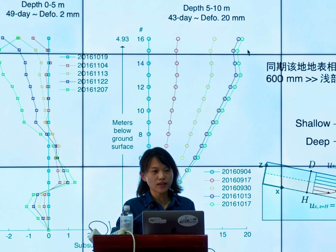 此外,胡燮研究员又为我们介绍了InSAR技术在探究由于地下水位变化所造成的地表形变以及相关工程项目中的应用。首先以美国犹他州盐湖城地下含水层为例,探究了人类工程活动和自然水文变化对地下应力场的扰动问题,并分析了该应力扰动对断层活动以及地震活动的影响。基于Sentinel-1的升降轨数据,胡燮研究员对比统计了盐湖城地区地表的季节性地表升降幅度,发现其变化可以达到40毫米;并通过分析地表季节性形变和地下水水位变化之间的关系来约束地下含水层的弹性蓄水系数,通过假设该值在时间上固定,由此就可以通过任一时期的地表形变数据来推测地下含水层蓄水量的变化;接下来胡燮研究员通过有限元分析计算了由于水文变化(湖泊、地下含水层、土壤湿度、降雪的变化)和矿山尾矿迁移在主断层上所产生的弹性应力扰动,以及每个含水层由于季节性含水率的变化在主断层上所造成的孔弹性应力扰动,并与该地区的年平均背景应力进行对比,认为该弹性应力扰动不足以影响断层活动并诱发地震;另一方面,犹他州地震活动在统计上缺乏显著的季节性,这也表明该地区周期性的水文变化对于断层活动的控制较弱。此外,胡燮研究员还介绍了多源遥感影像以及InSAR技术在相关工程项目中的研究,例如天津地下水开采所导致的地面沉降区域和沉降速率变化的研究,以及陕西延安平山造城示范性工程项目的地表形变以及黄土固结沉降速率的研究。