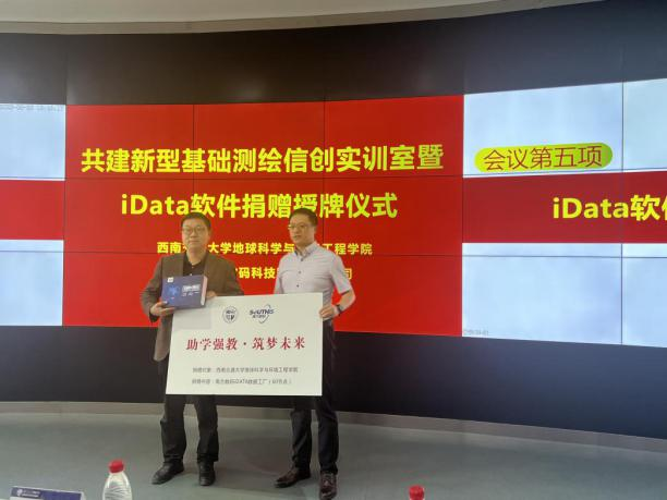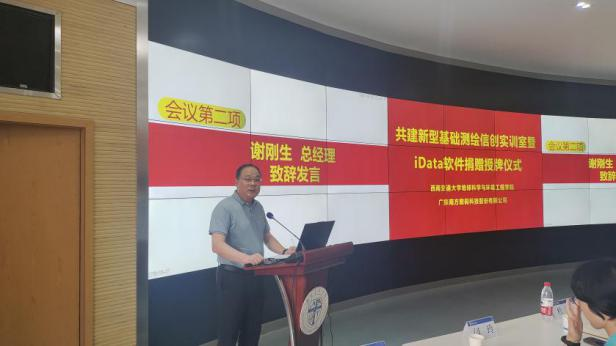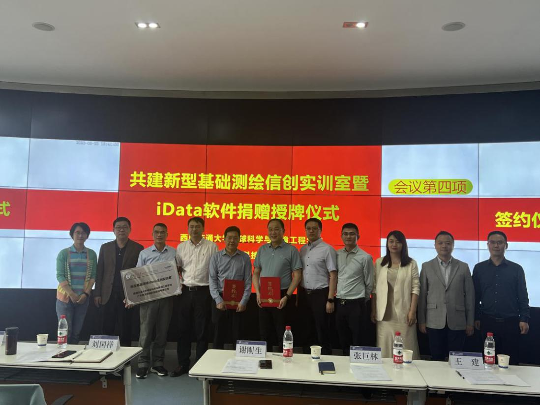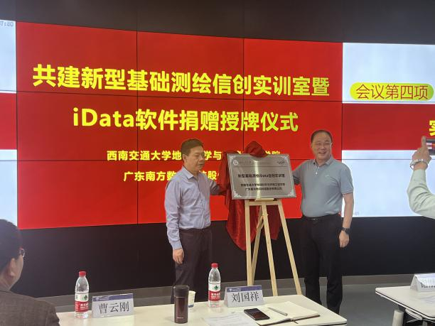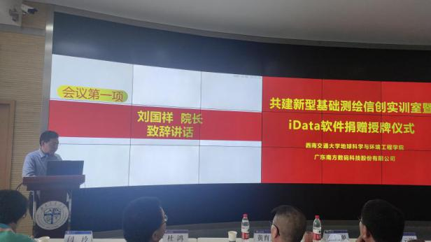 2023年5月23日下午,西南交通大学地球科学与环境工程学院与广东南方数码科技股份有限公司(以下简称“南方数码”)在西南交通大学犀浦校区X4243会议室举行了新型基础测绘信创实训室暨iData软件捐赠授牌仪式及主题讲座。参加本次活动的领导和嘉宾有:南方数码集团总部谢刚生总经理、南方数码渠道发展部张巨林总监、南方数码成都分公司王建总经理、西南交通大学地球科学与环境工程刘国祥院长、测绘遥感信息系曹云刚主任、张同刚副主任、测绘实验中心黄育龙主任等。