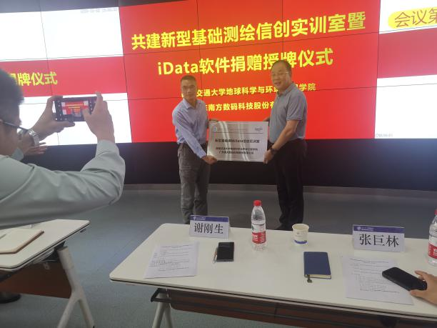 在本次活动的第二阶段,由西南交通大学地球科学与环境工程学院刘国祥院长与南方数码集团总部谢刚生总经理为“新型基础测绘信创实训室”揭牌,并签署了校企合作协议。谢刚生总经理、测绘实验中心黄育龙主任进行了实验室授牌仪式,张巨林总监代表南方数码向测绘学科代表张同刚副主任捐赠了60个网络节点的“南方数码iDATA数据工厂”软件。