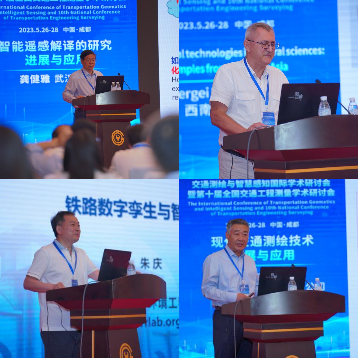 会议特邀报告由东南大学高成发教授、西南交通大学李志林教授共同主持,加拿大卡尔加里大学Yang Gao教授、北京航空航天大学国家级人才施闯教授、兰州交通大学国家级人才闫浩文教授、武汉大学国家级人才张永军教授、武汉大学国家级人才杨必胜教授、西南交通大学Lutz Plümer教授、武汉大学国家级人才张小红教授、同济大学国家级人才李博峰教授、中南大学国家级人才李志伟教授等9位专家做了特邀报告。他们报告的题目分别为“Low-cost precision GNSS and sensor integration for intelligent transportation systems”、“北斗导航与时空服务发展研究”、“空间相似关系”、“多模态卫星影像摄影测量遥感智能处理关键技术及工程应用”、“数字孪生城市交通基础设施”、“Application of geomatics in navigation and precision agriculture”、“多源融合增强PPP-RTK及其在交通工程中的应用”、“GNSS长距离RTK与毫米级实时监测技术”和“InSAR三维形变测量”。