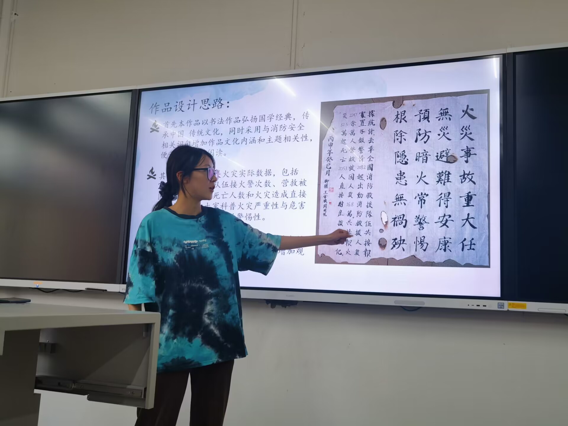第二组同学的作品是一幅特殊处理的书法。这幅书法在弘扬了国学经典、传承中国传统文化的同时,采用与消防安全相关的原创诗句增加了作品的文化内涵和主题相关性。残缺的火灾烧痕,更提醒我们要重视消防安全。