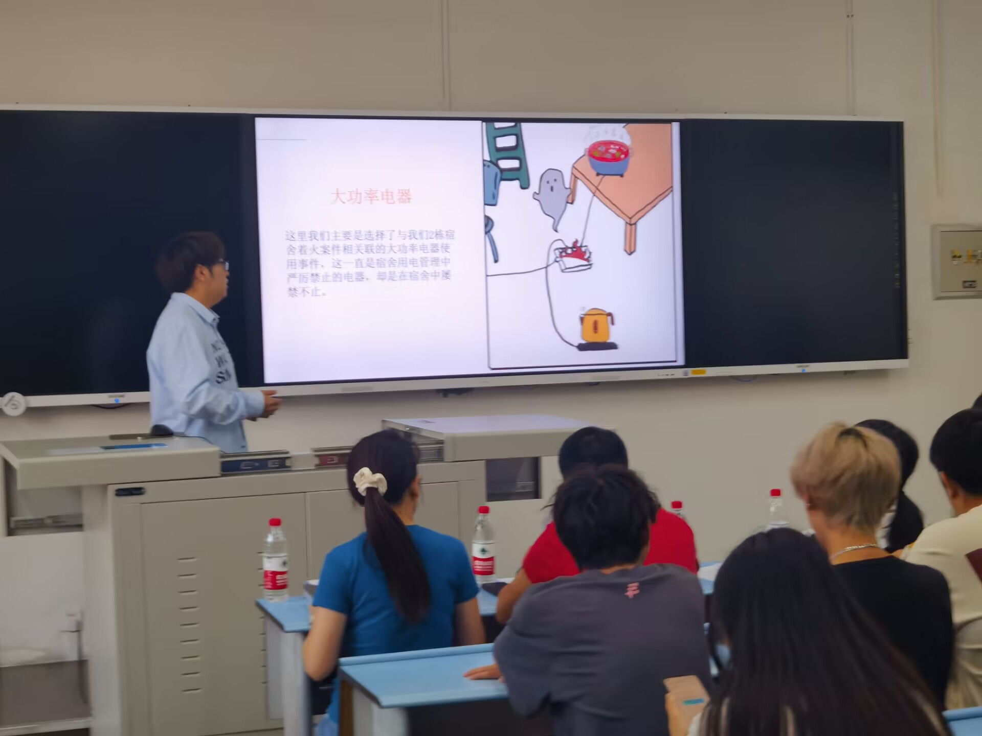 首先上台的同学通过讲解漫画形式的宿舍火灾案例,生动地展示了我们生活中存在的火灾隐患,敲响了大家心中消防安全的警钟,使同学们通过看漫画,认识了各类火灾隐患,了解了宿舍火灾预防相关的消防知识。