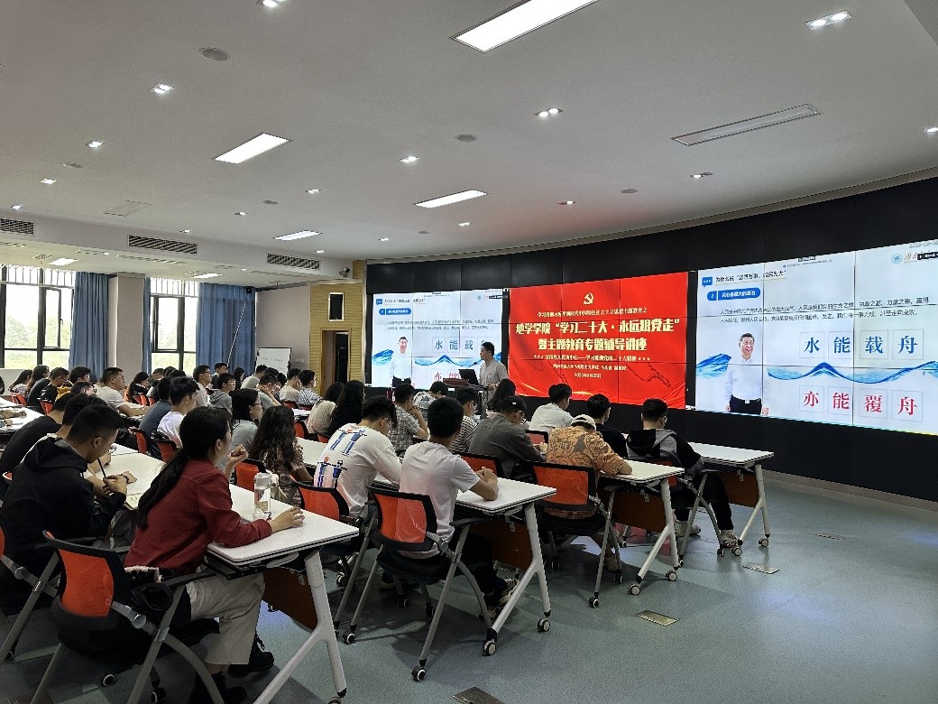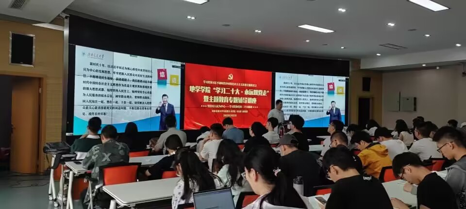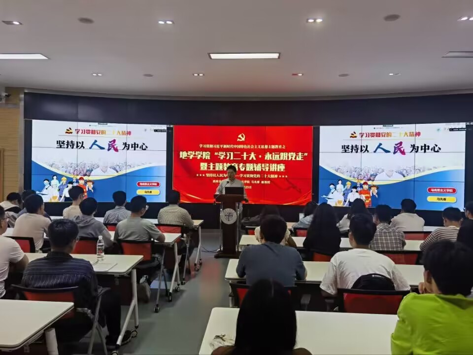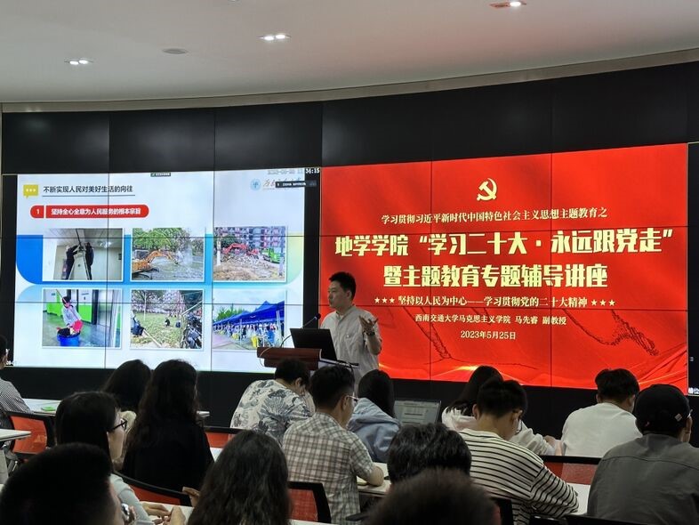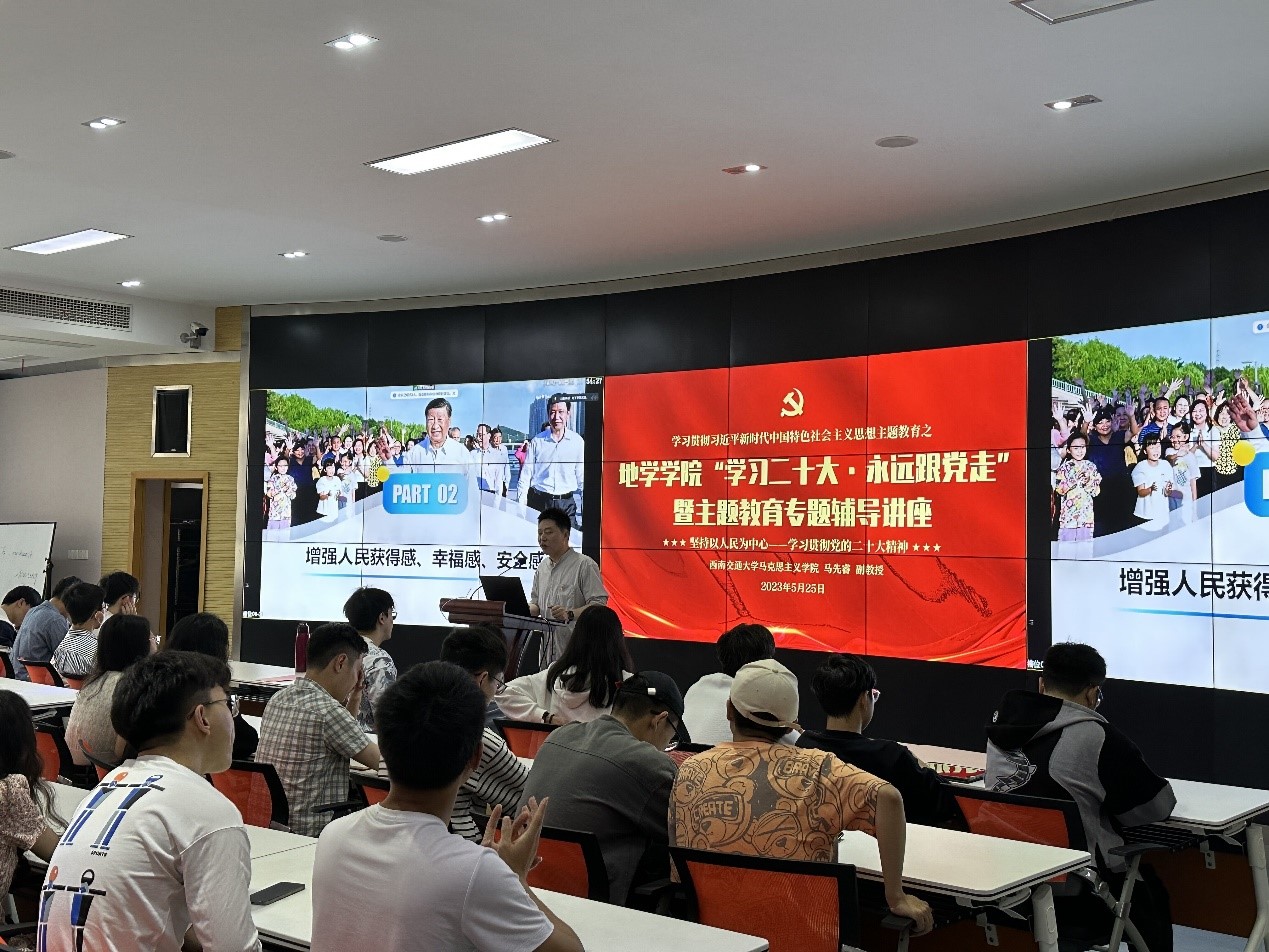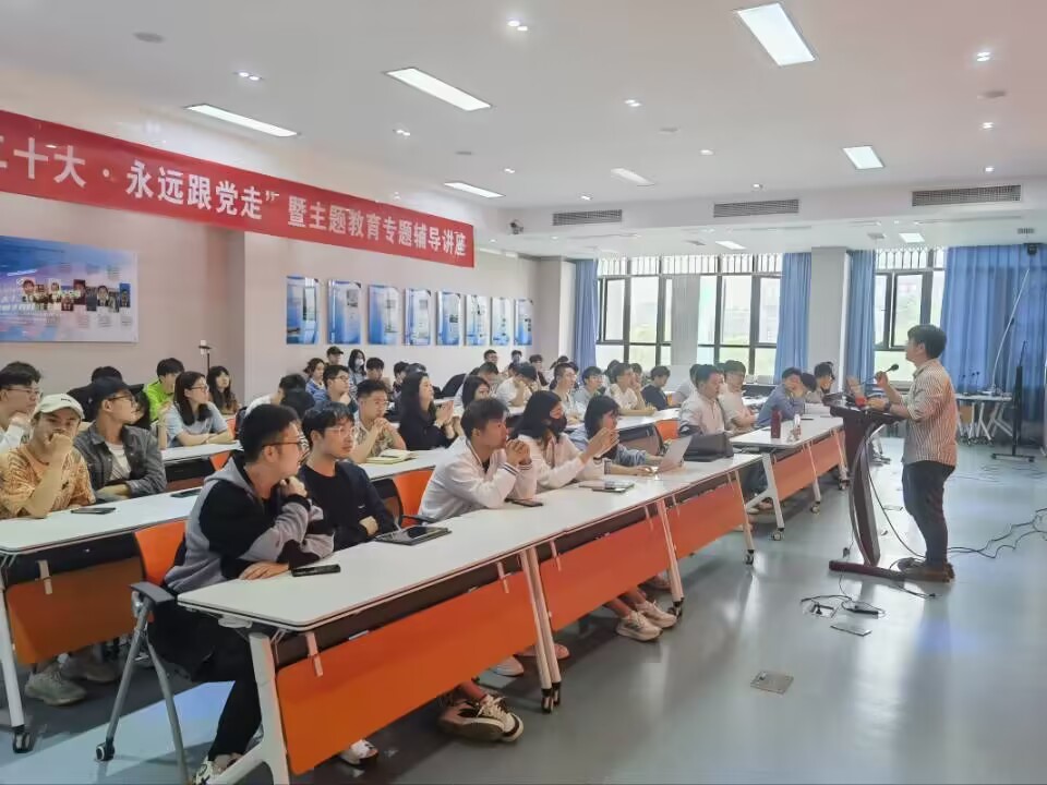 在X4243会议室举行“学习二十大·永远跟党走”暨主题教育专题辅导讲座,讲座由学院学生党建负责人文强主持,马克思主义学院副教授、西南交通大学学习贯彻党的二十大精神师生巡讲团成员马先睿老师主讲,院内各本、硕、博学生党员代表80余人参加讲座。