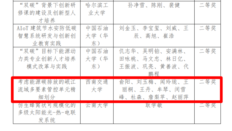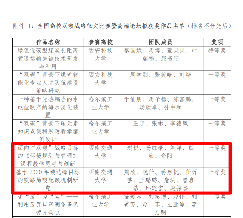赵锐老师团队作品《面向“双碳”战略目标的〈环境规划与管理〉课程教学思考与创新》和熊欣老师团队作品《基于2023年碳达峰目标的铁路局碳配额机制研究》荣获一等奖,俞阳老师团队作品《考虑能源碳排放的岷江流域多要素管控单元精细划分》荣获二等奖。