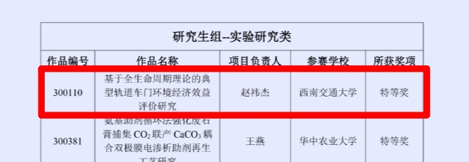 学生赵祎杰荣获研究生组实验研究类特等奖,获奖作品为《基于全生命周期理论的典型轨道车门环境经济效益评价研究》。