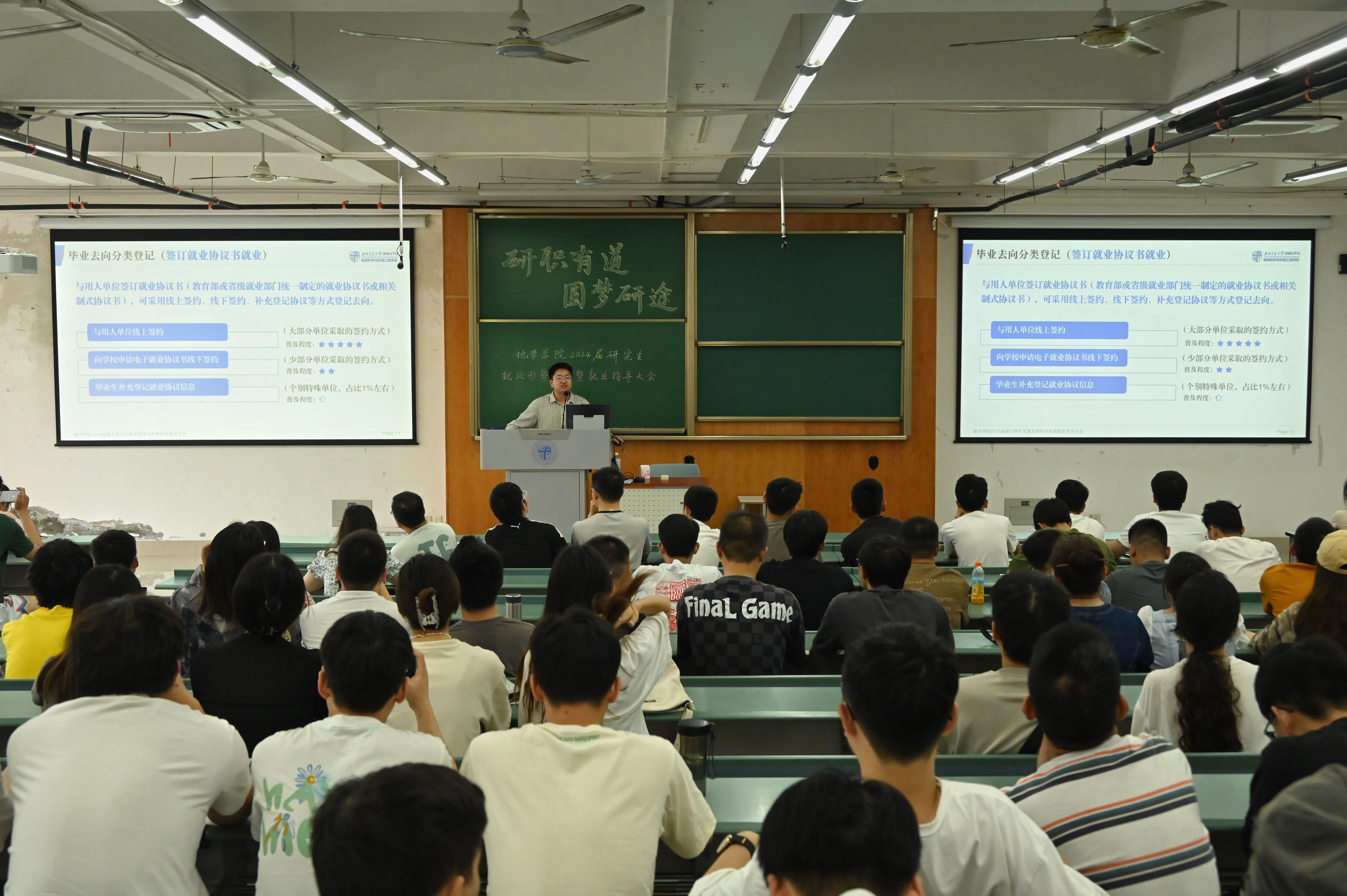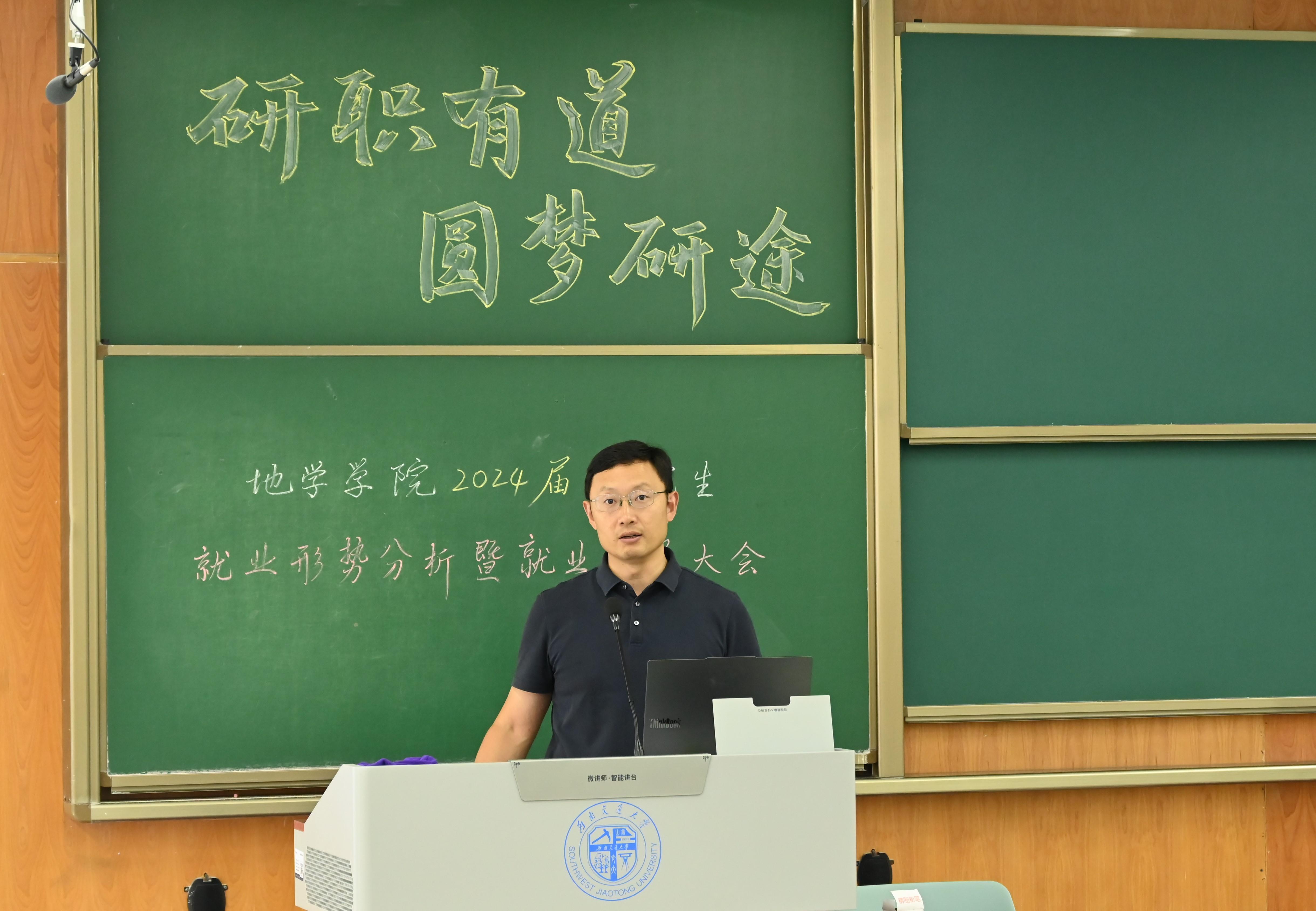 于犀浦校区X4350教室举办了2024届研究生就业形势分析暨就业指导大会,本次会议由2021级研究生辅导员文强主持,学院党委副书记郑波出席、全体2024届研究生参加。