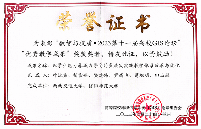 2023年9月22-24日,第十一届高校GIS论坛在甘肃兰州成功举行,本届会议主题为“数智与提取”。西南交通大学地球科学与环境工程学院青年教师团队的教学成果“以学生能力养成为导向的多层次实践教学体系改革与优化”项目获得全国高校GIS优秀教学成果奖。该项目由朱庆教授指导,叶沅鑫,杨雪峰,樊建伟,尹高飞,葛旭明,田玉淼为项目参与人员,建立了以培养学生能力为导向的多层次实践教学体系,提出了以科研项目为驱动的产学研人才培养新模式,推动了高校与科研院所、企事业单位共建实践教学平台,形成了创新实践的人才培养体系,培养了一大批优秀学生。
