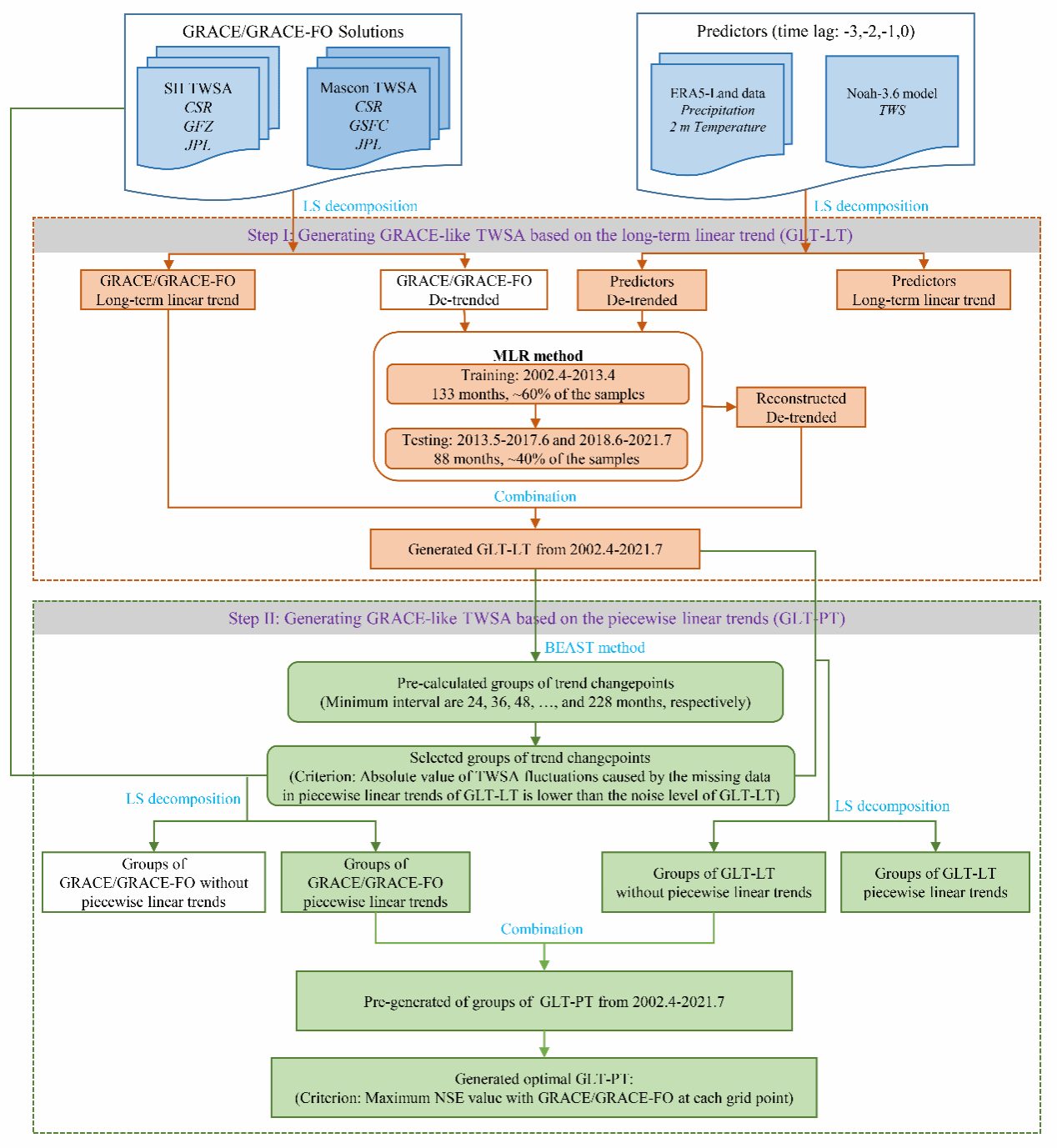 图 1 . 利用双步线性模型重构GRACE/GRACE-FO陆地水储量变化流程图