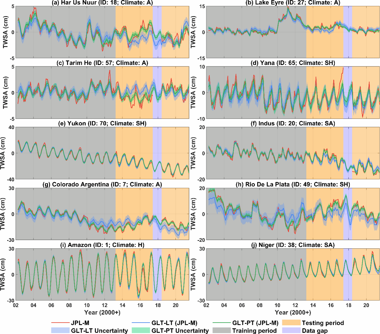 图 2 . 原始的GRACE/GRACE-FO数据和重构数据在全球10个代表性流域的时间序列