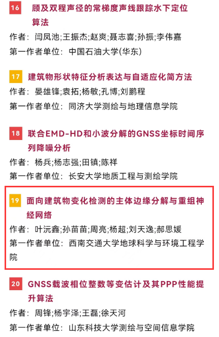 “叶沅鑫,孙苗苗,周亮,杨超,刘天逸,郝思媛.面向建筑物变化检测的主体边缘分解与重组神经网络[J].测绘学报,2023,52(1):71-81”成功入选《测绘学报》2023年度优秀论文。