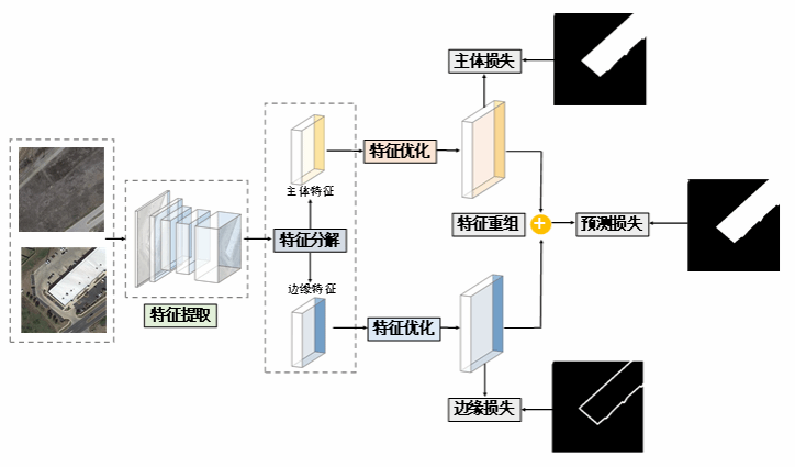 该论文针对建筑物变化检测中传统神经网络易产生“锯齿形边界”、难以准确识别密集建筑物区域变化地物边界的问题,提出了一种基于主体、边缘分解与重组网络的变化检测方法。该方法对建筑物主体与边缘分别建模,并设计特征优化结构,利用主体标签和边缘标签对分离后的主体特征和边缘特征进行精准优化,最后将优化后的主体与边缘特征进行重组,以形成端到端的变化检测模型。该方法能够准确识别变化建筑物的边界,获得更优的变化检测结果。