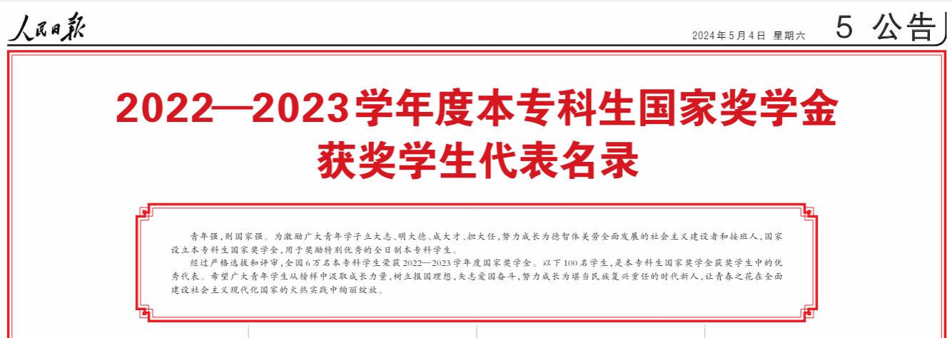 2022-2023学年度本专科生国家奖学金获奖学生代表名录发刊词: