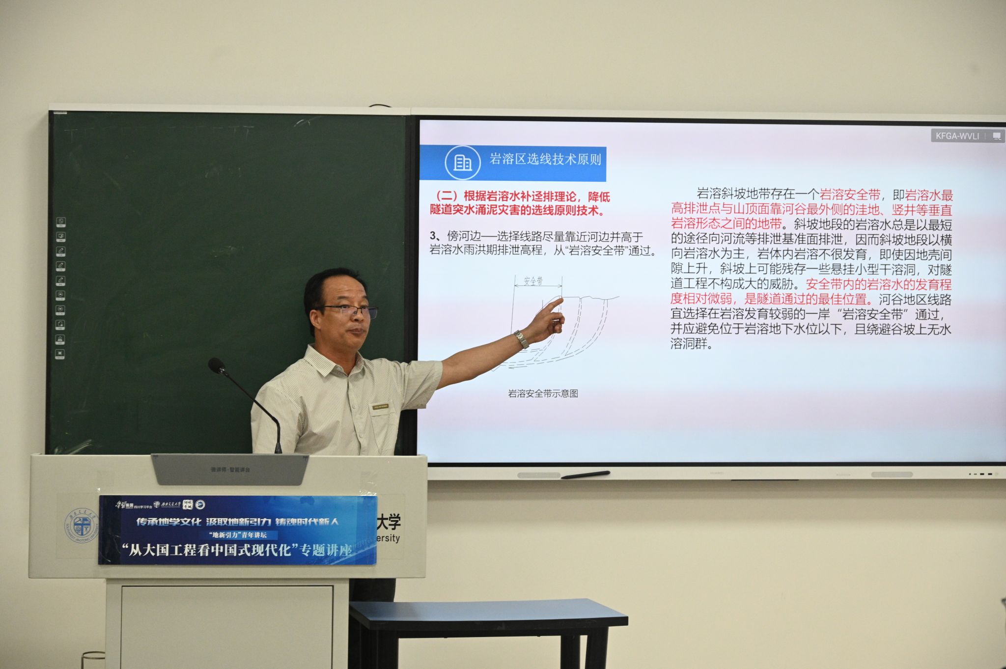 在四号教学楼X4247教室隆重举办了“从大国工程看中国式现代化”专题五讲座。本次讲座聚焦岩溶区铁路综合选线技术,邀请了业内知名专家中铁二院教授级高工曹化平作为主讲人,讲座由韩国漫画