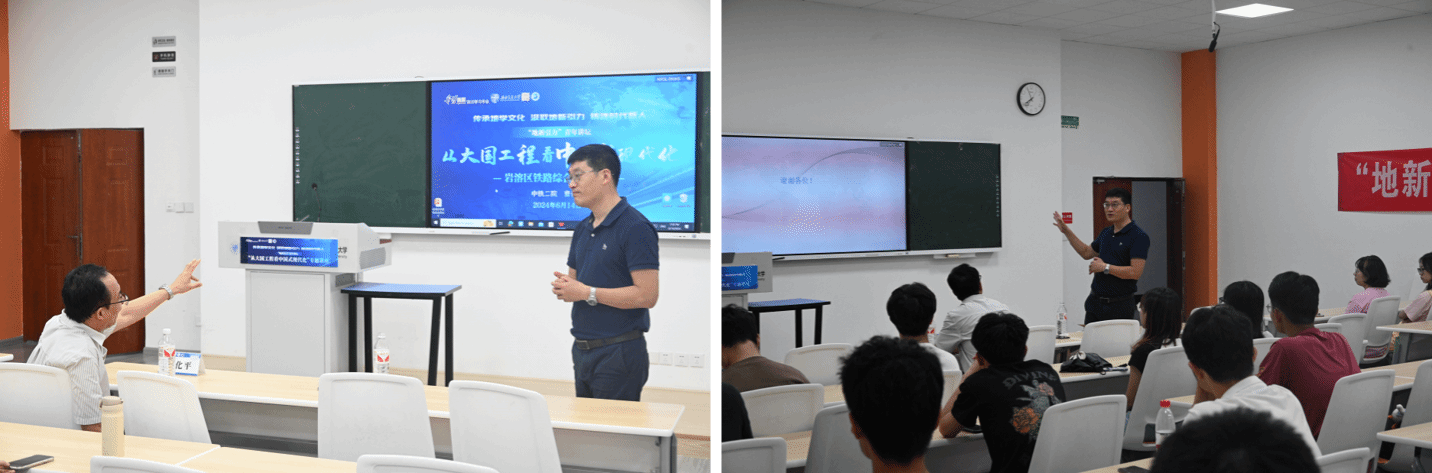 通过50多年来西南岩溶区十余条铁路干线和近10余年来的武广、渝利、贵广等岩溶高速铁路的勘察设计实践,结合岩溶致灾机理总结出“二十四字”岩溶减灾选线指导原则以及方案体系。曹化平的讲解内容丰富、案例详实,引起了在场学生的浓厚兴趣。