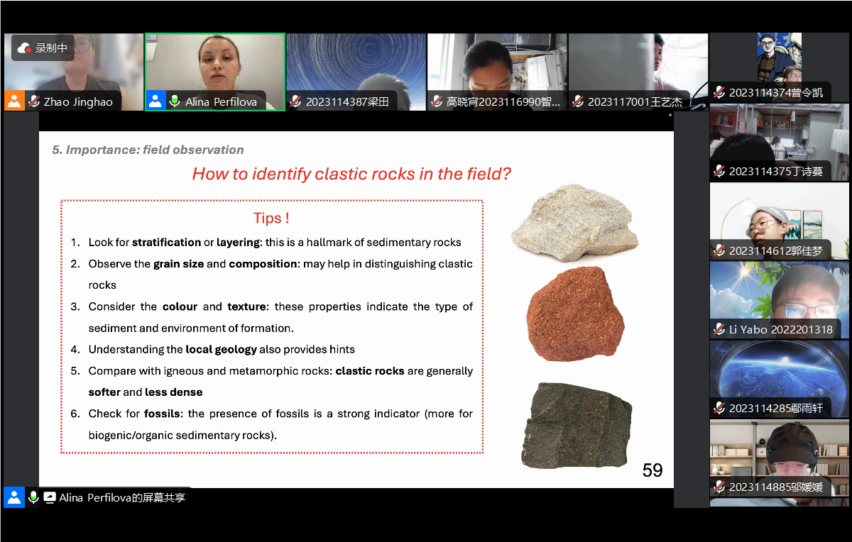 Alina老师首先介绍了碎屑岩的相关概念、分类及其一般特征,如粒度大小、纹理、沉积结构和矿物组成等,接着介绍了沉积环境与成岩作用,并详细讲述了碎屑岩风化问题和风化机制,最后通过实例讲解了如何识别野外的沉积岩,及其在地层学和地质测绘中的重要性。