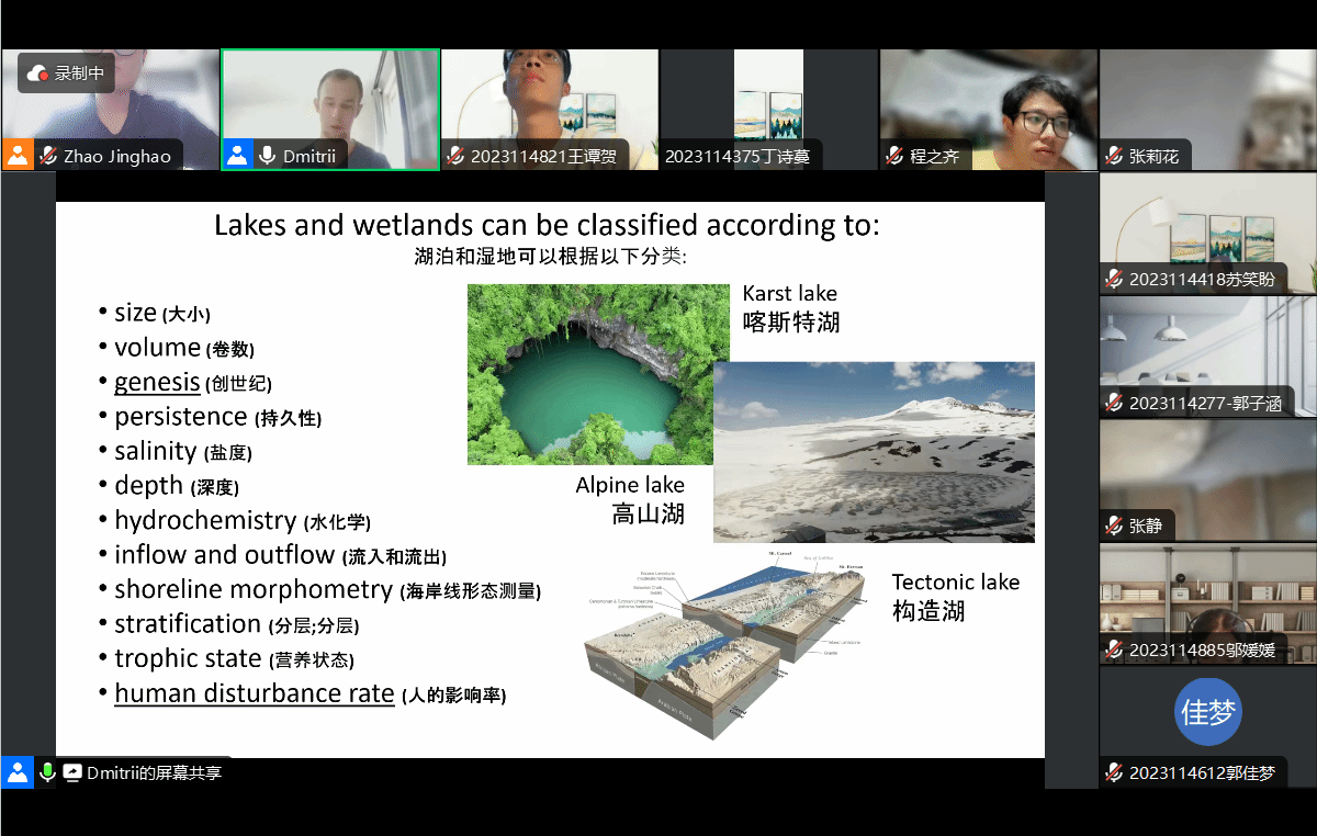 Sergei老师课程的第一部分阐述了环境变化是联合国等国际组织,以及中国、美国等国家所关注的重要问题,并介绍了这些国际组织的结构和章程,以及这些组织所支持的一些国际研究项目。在课程的第二部分,Sergei老师介绍了关于湖泊研究的国际组织、国际项目和研究成果,并阐述了这些成果对我们更好地了解全球和区域的环境变化具有重要意义。