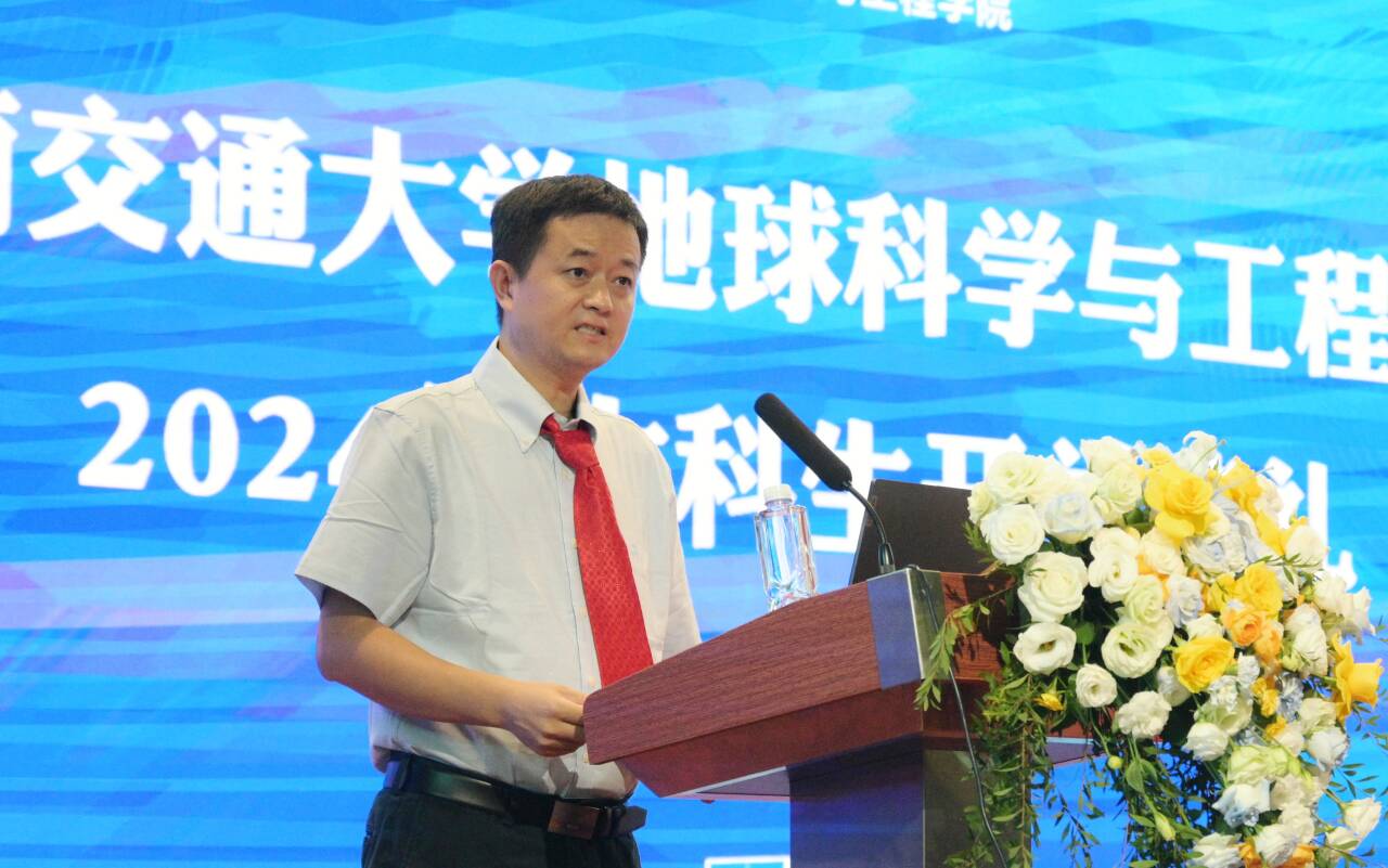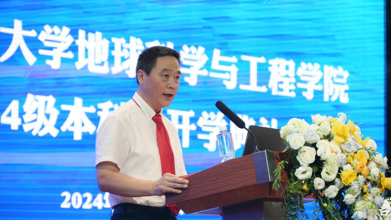 党委书记关秦川致欢迎辞。关秦川代表学院向461名新同学们表示热烈的欢迎和美好的期望,并借助即将到来的中秋佳节,与同学们分享了几点感悟。他表示,踏上崭新的人生旅程,意味着“离别”,但也迎来了新的“团圆”,希望同学们珍惜彼此之间的相遇与陪伴,在学习与生活中互相支持、共同进步。他通过列举地学人经历短暂的离别,重逢美好,成就更好的自己的故事,告诫同学们离别并不是一种痛苦,而是成长的必经之路。在这个充满团圆与分离交织的时刻,他希望同学们能够勇敢前行,以积极的态度迎接未来的每一个挑战,以今天为起点,在成长的道路上,珍惜团圆,不畏分离,精勤求学,敦笃励志,忠恕任事,果毅力行,努力成为更好的自己,接续起经天纬地、勘物探理的地学报国的光荣与梦想。