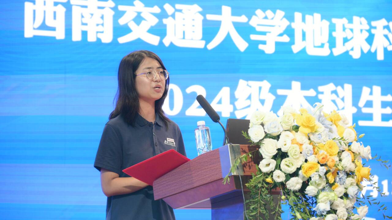 新生代表2024级测绘类专业刘瑞焱同学发言。她表达了对于未来交大生活的憧憬,号召同学们当以梦想为帆,用行动作桨,向着诗和远方,向着星辰大海,踔厉奋发,实干为要,祝愿同学们怀揣热爱成就梦想,在推进强国建设、民族复兴伟业中展现青春作为、彰显青春风采、贡献青春力量,奋力书写新时代交大人为中国式现代化挺膺担当的青春篇章。
