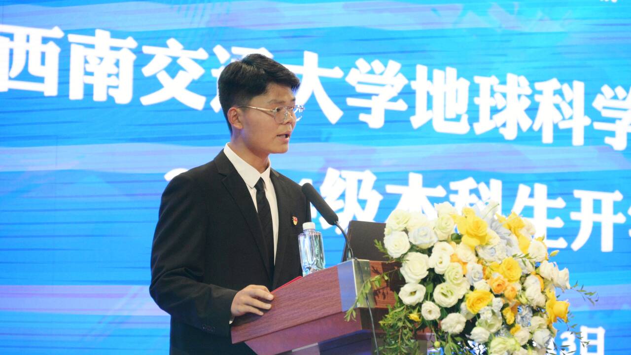 学生代表学生会主席团成员、2022级地质工程专业廖望同学发言。他呼吁同学们以实干者的姿态,迎接大学生活中的每一个挑战,扬起青年时代之风帆;重视学习的深耕过程,主动将理论知识转变为实践行动,在实干中不断增强社会责任感,在为实现中华民族的伟大复兴中兑现交大人“精勤求学,敦笃励志,果毅力行,忠恕任事”的庄严承诺。