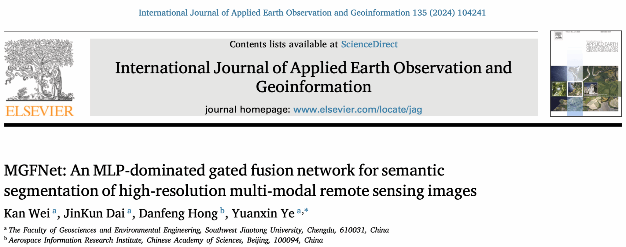 Wei, K., Dai, J., Hong, D., Ye, Y.*, 2024. MGFNet: An MLP-dominated gated fusion network for semantic segmentation of high-resolution multi-modal remote sensing images. International Journal of Applied Earth Observation and Geoinformation 135, 104241.