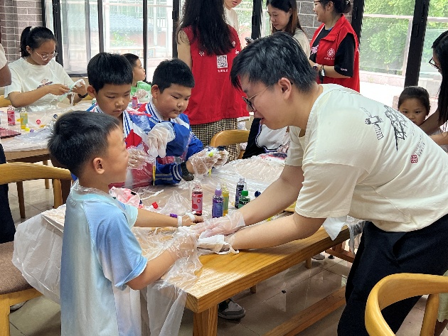 志愿者与社区儿童结对合作,共同完成扎染和贝壳画作品。孩子们天马行空的创意与志愿者耐心的指导相映成趣。一幅幅色彩斑斓的作品不仅展现了童真,更凝聚了两地青年的协作精神。香港理工大学的陈同学感慨道:“孩子们教会我用更简单的视角看世界,这种双向的成长令人难忘。”