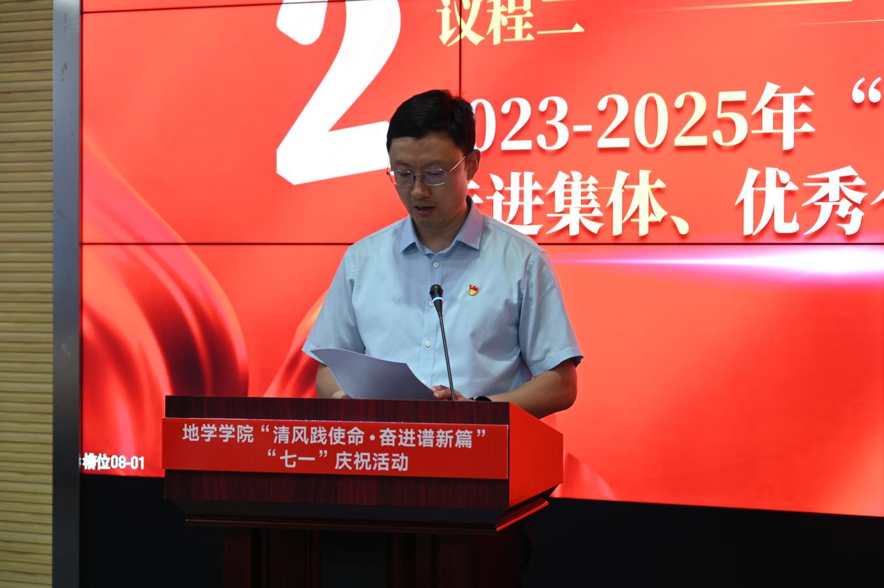 于X4243会议室隆重举行“清风践使命·奋进谱新篇”“七一”庆祝活动,共同庆祝党的生日,表彰先进,激励全院师生党员牢记使命、砥砺前行。学院党委书记关秦川、党委副书记兼纪委书记郑波、党委委员胡卸文出席大会,全院师生党员代表参加活动。大会由学院党委组织员李晓宇主持。