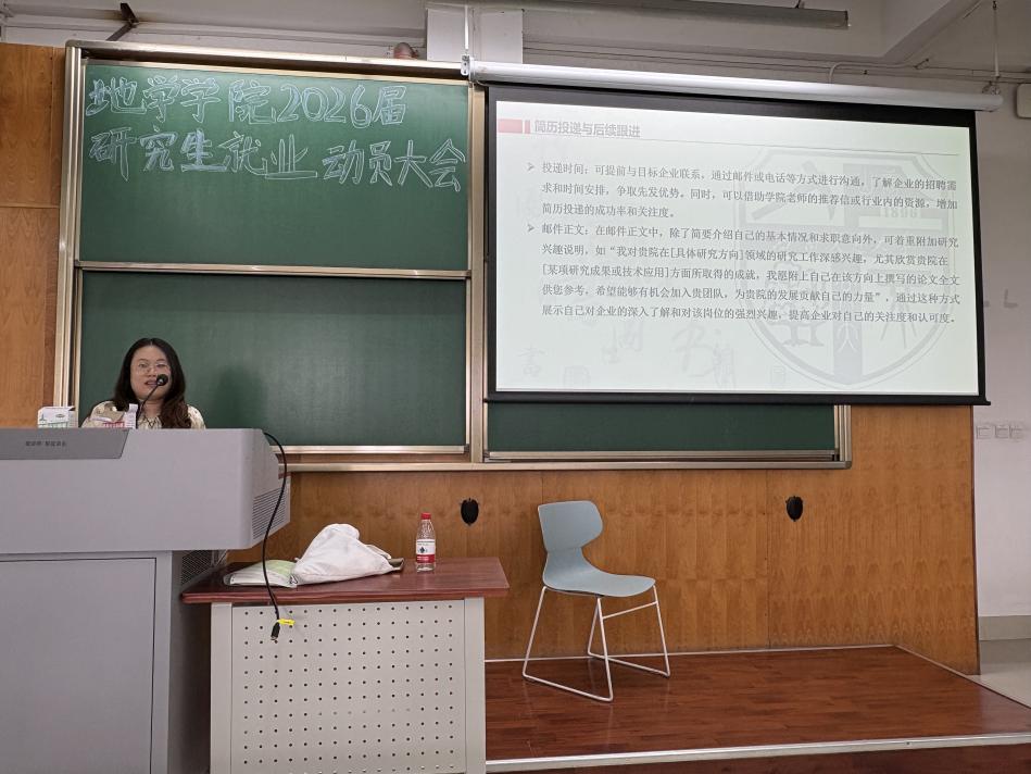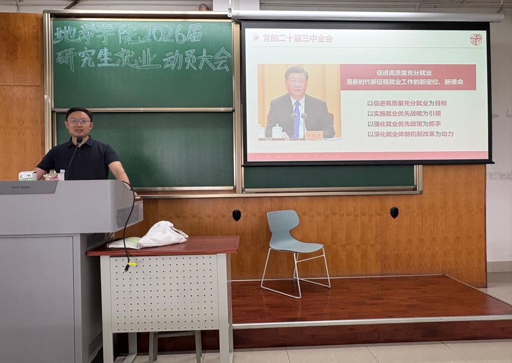 党委副书记郑波、中级生涯导师王琼以及就业专项负责人孙惠敏和全体2026届研究生参会。本次大会由2023级研究生辅导员韩沁儒主持。